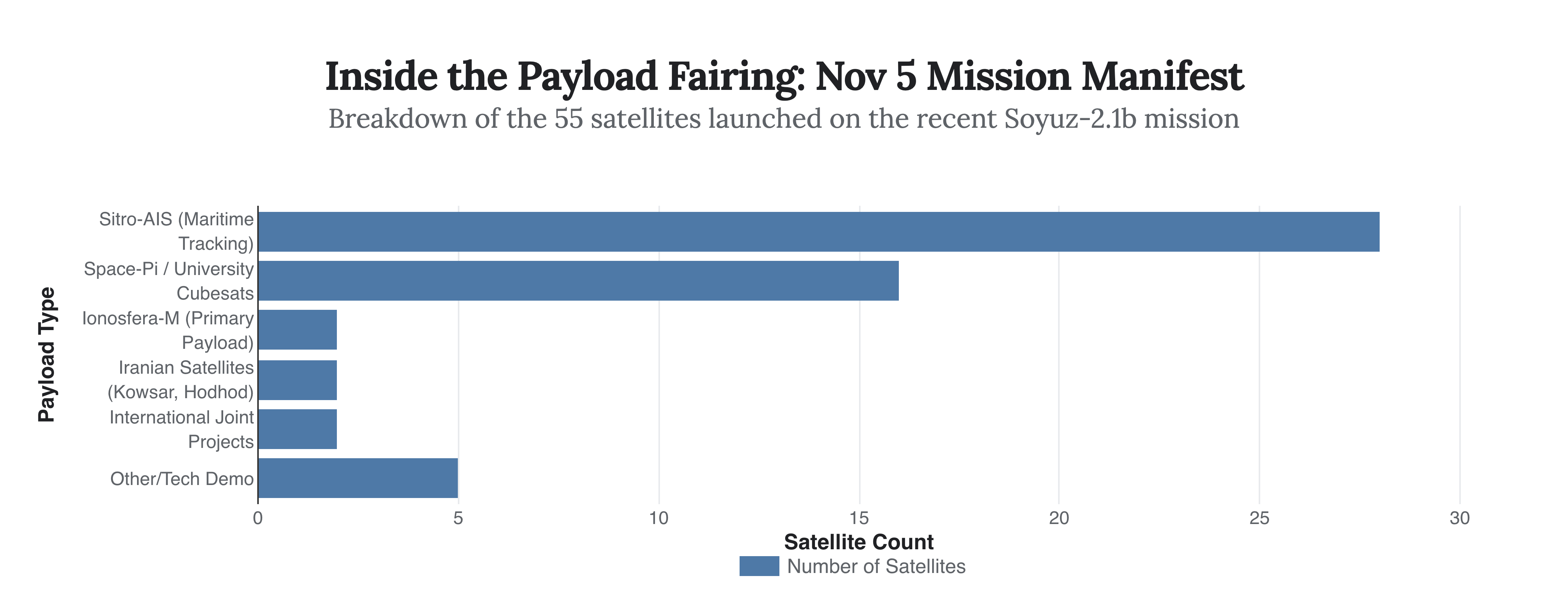 The manifest reveals a strategic prioritization of dual-use technology. The bulk of the cluster consisted of 28 Sitro-AIS satellites, designed for automatic identification system (AIS) maritime tracking—a critical capability for monitoring global shipping lanes. The inclusion of Iranian satellites, specifically the privately developed Kowsar and Hodhod, underscores the deepening technological cooperation between Moscow and Tehran despite ongoing international sanctions.