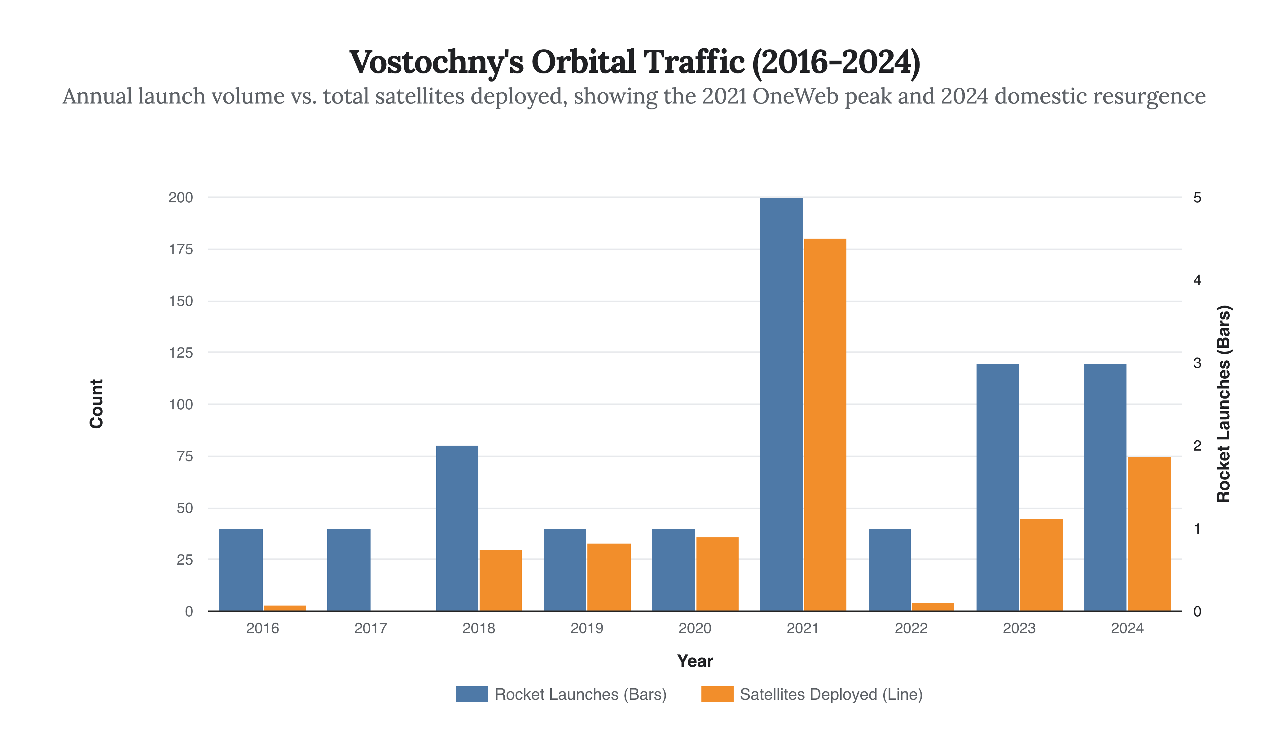 The data above illustrates a fascinating trend. The spike in 2021 was driven by the commercial OneWeb contract, which launched hundreds of satellites before the partnership collapsed due to geopolitical fallout in 2022. The sharp drop in 2022 reflects that severance. However, 2023 and 2024 show a resurgence, this time driven by domestic demand rather than foreign contracts. The 75 satellites launched from Vostochny in 2024 (including the 55 from this single mission) prove that Roscosmos is aggressively attempting to fill the void with homegrown constellations and friendly-nation partnerships.