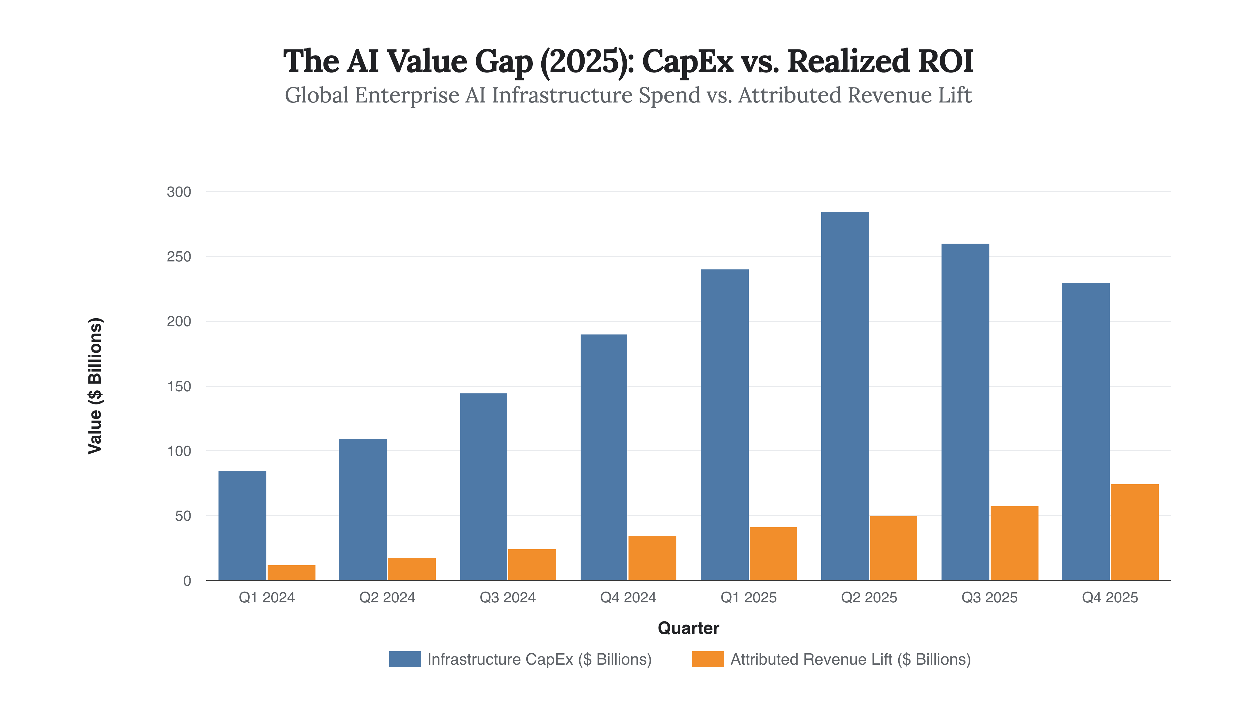 Our analysis of enterprise spending across the Global 2000 indicates a massive decoupling between Infrastructure CapEx (buying the GPUs) and Application Value (the revenue generated). This created a “Value Gap” that defined the mid-year market correction.