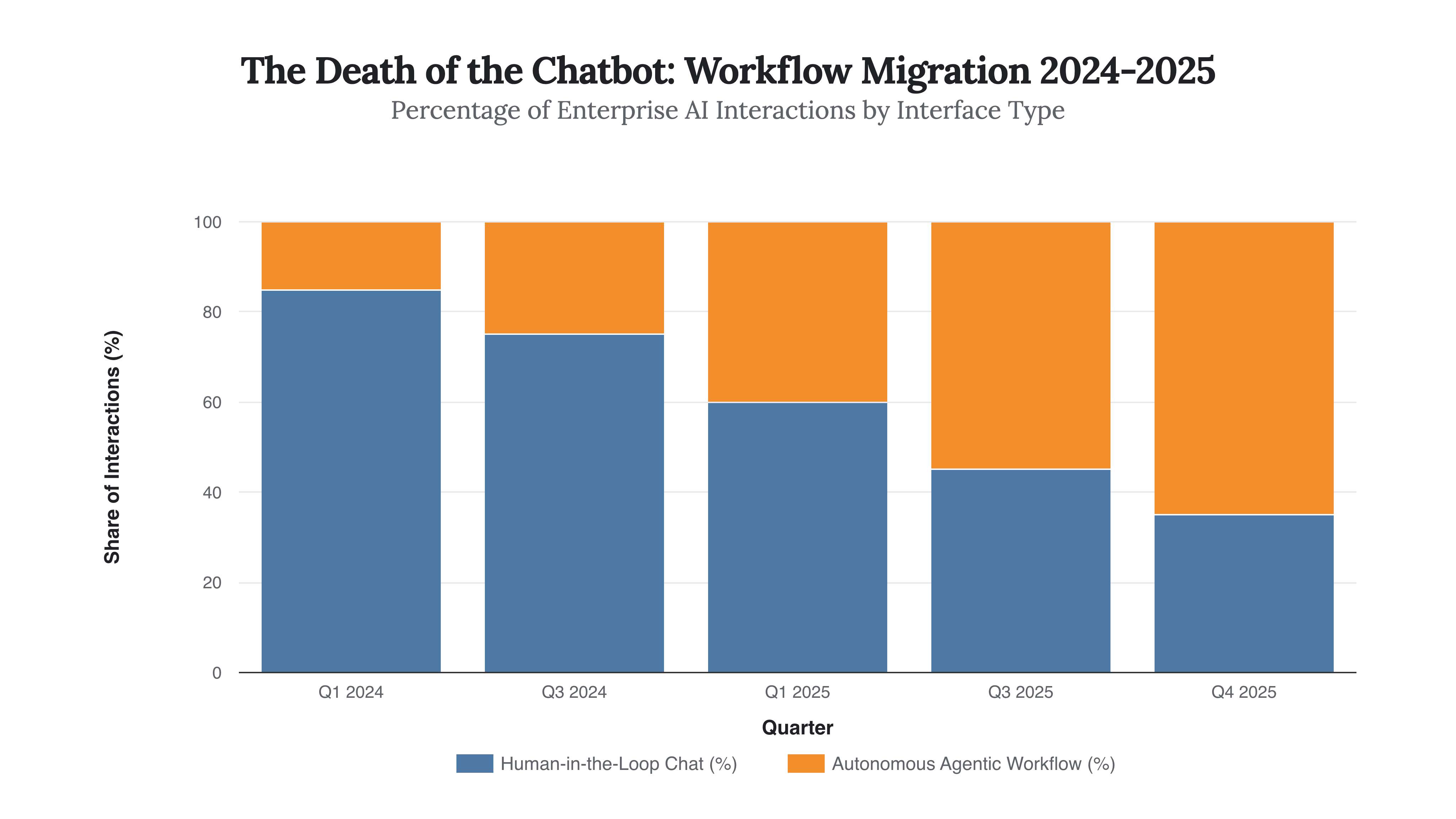 Despite the CapEx pullback, actual adoption of agentic workflows surged—but only where the scope was ruthlessly defined. The data shows a massive migration away from open-ended “Chat” interfaces toward invisible, background processes.