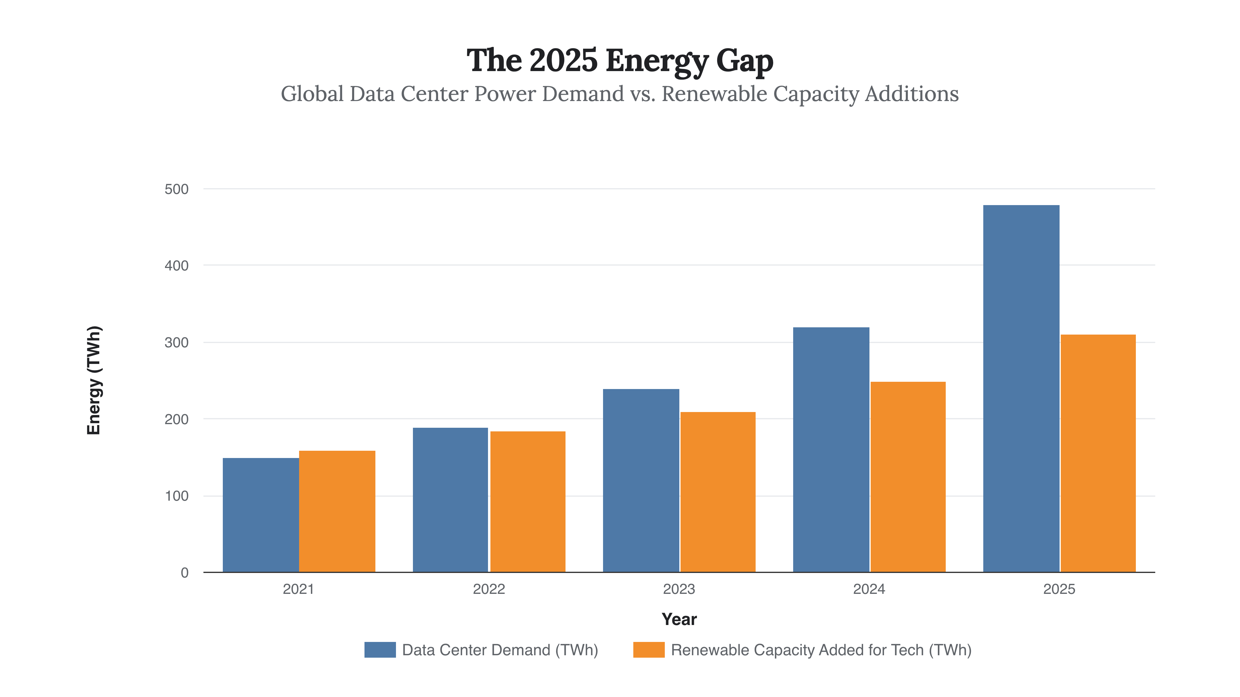 The chart above explains why “Sustainable Tech” dropped from a marketing slogan to a survival imperative in 2025. The gap (the distance between the blue and orange lines) represents the resurgence of natural gas and the desperate rush for Small Modular Reactors (SMRs) to fill the void.