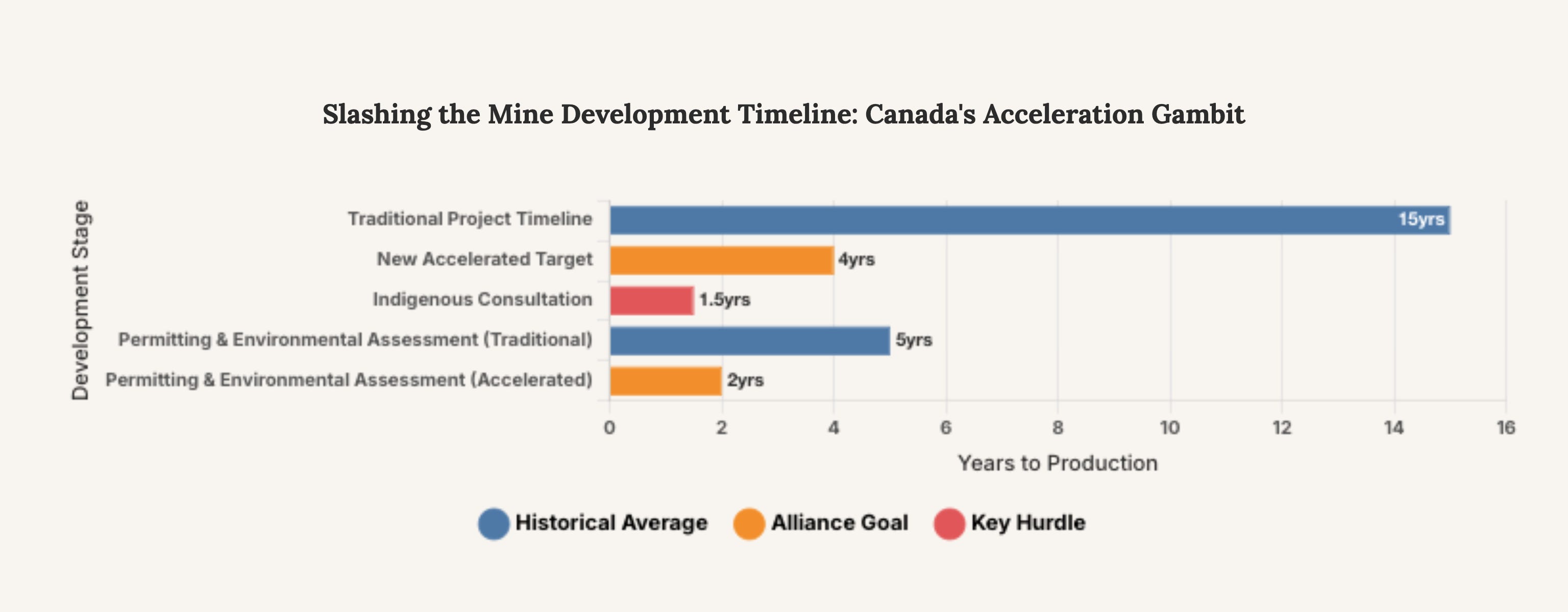 This chart illustrates the dramatic compression of project timelines Canada aims to achieve through its new Critical Minerals Production Alliance. The goal is to reduce the 15-year average to a 3-5 year sprint, though significant hurdles like Indigenous consultation remain fixed points in the process.