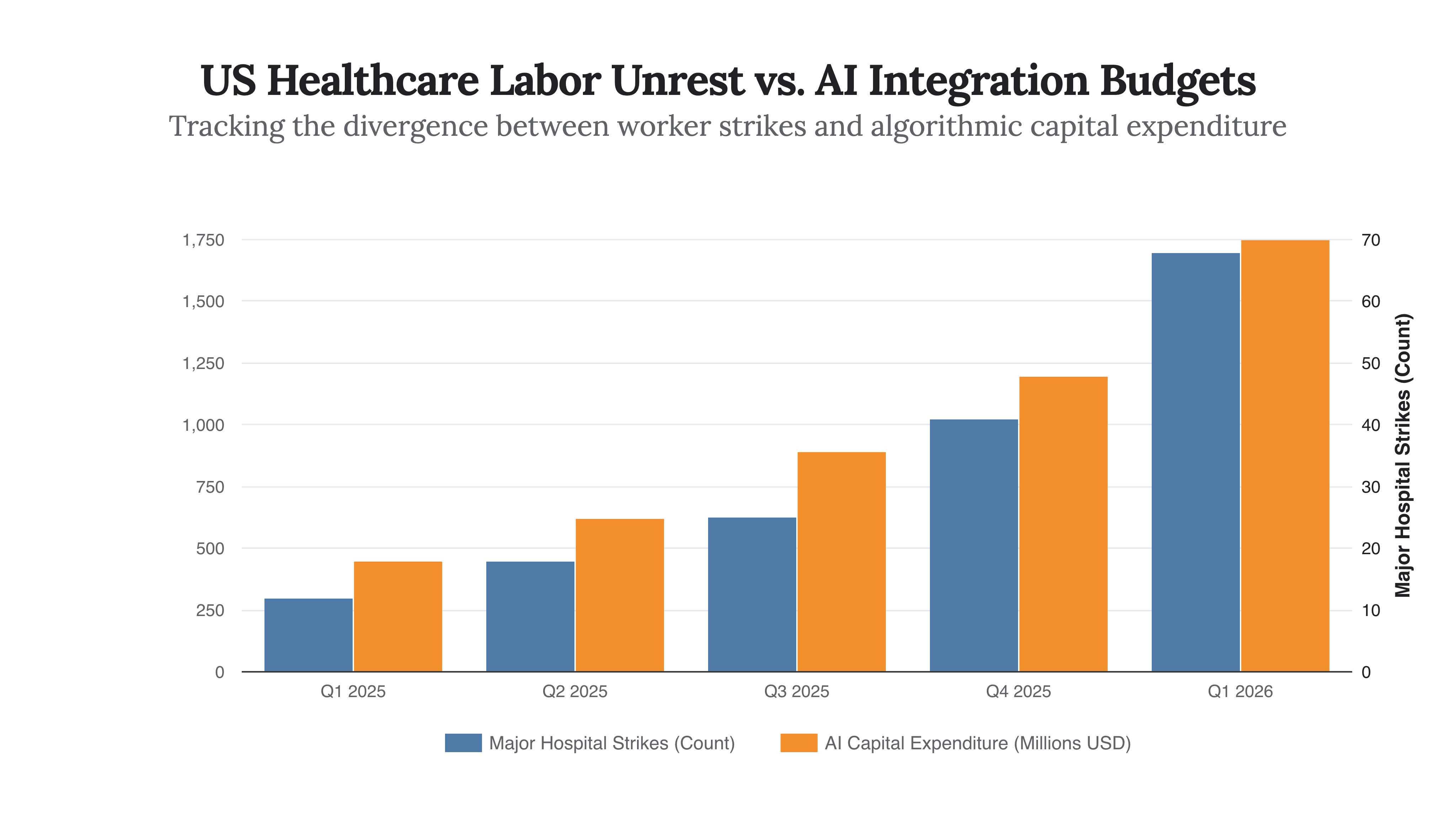 The interactive data above illustrates a stark, undeniable inverse relationship. As hospital networks exponentially increased their capital allocation toward AI diagnostic and transcription suites throughout 2025, the frequency of major organized labor strikes surged in lockstep. This is not a coincidence; it is a direct reaction to the perceived threat of obsolescence. Capital is being aggressively diverted away from human payrolls and funneled directly into server racks.