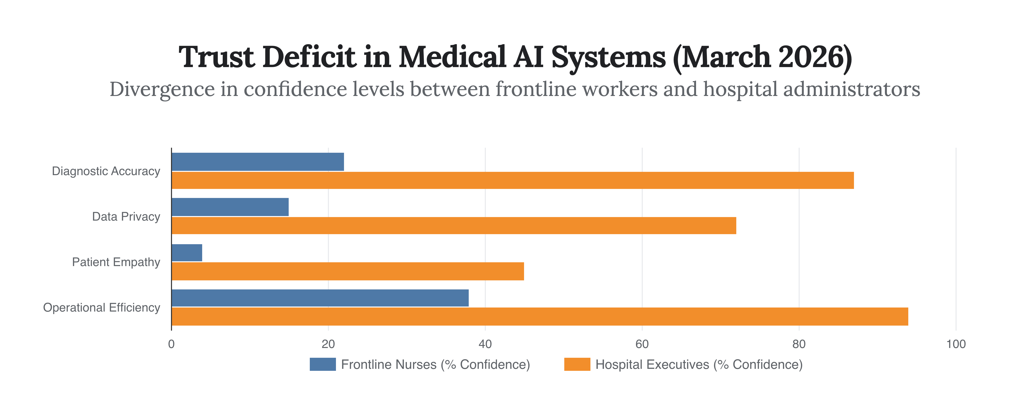 The chasm in trust depicted in the second chart reveals the core of the institutional rot. While 94% of hospital executives believe AI improves operational efficiency, only 38% of frontline nurses agree. More alarmingly, 87% of administrators trust AI diagnostic accuracy, compared to a dismal 22% of the nurses actually administering the care. The workers on the floor see the hallucinations, the missed nuances, and the systemic errors that the executives choose to ignore in favor of lower overhead costs.