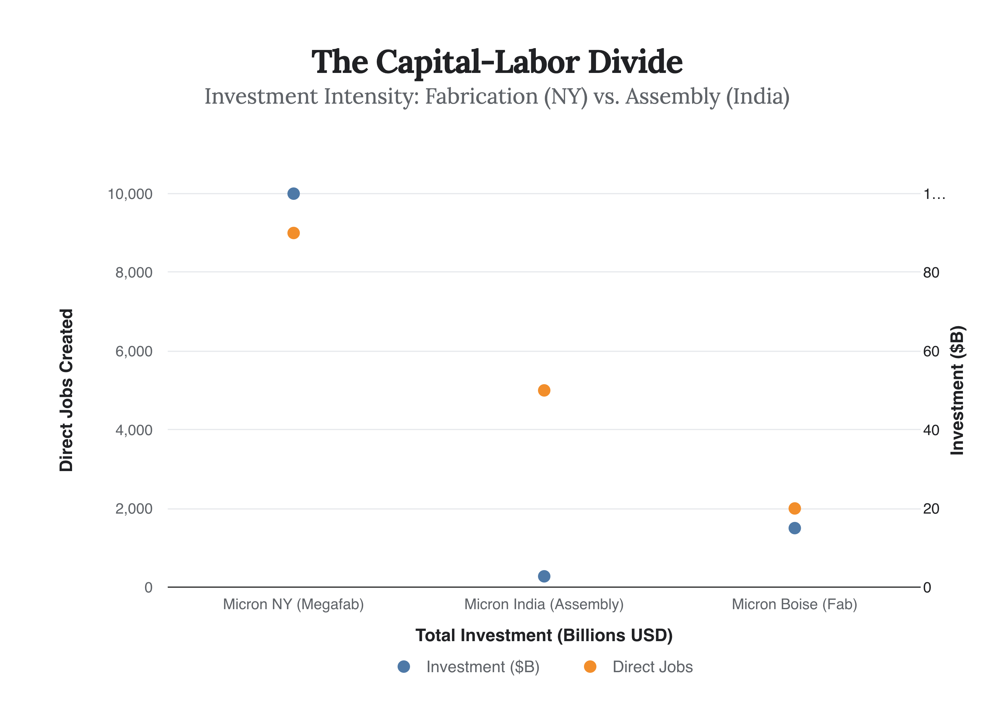 It costs Micron ~$11 million in capital to create one job in New York, versus ~$0.55 million per job in India, revealing the extreme automation of modern fabs.