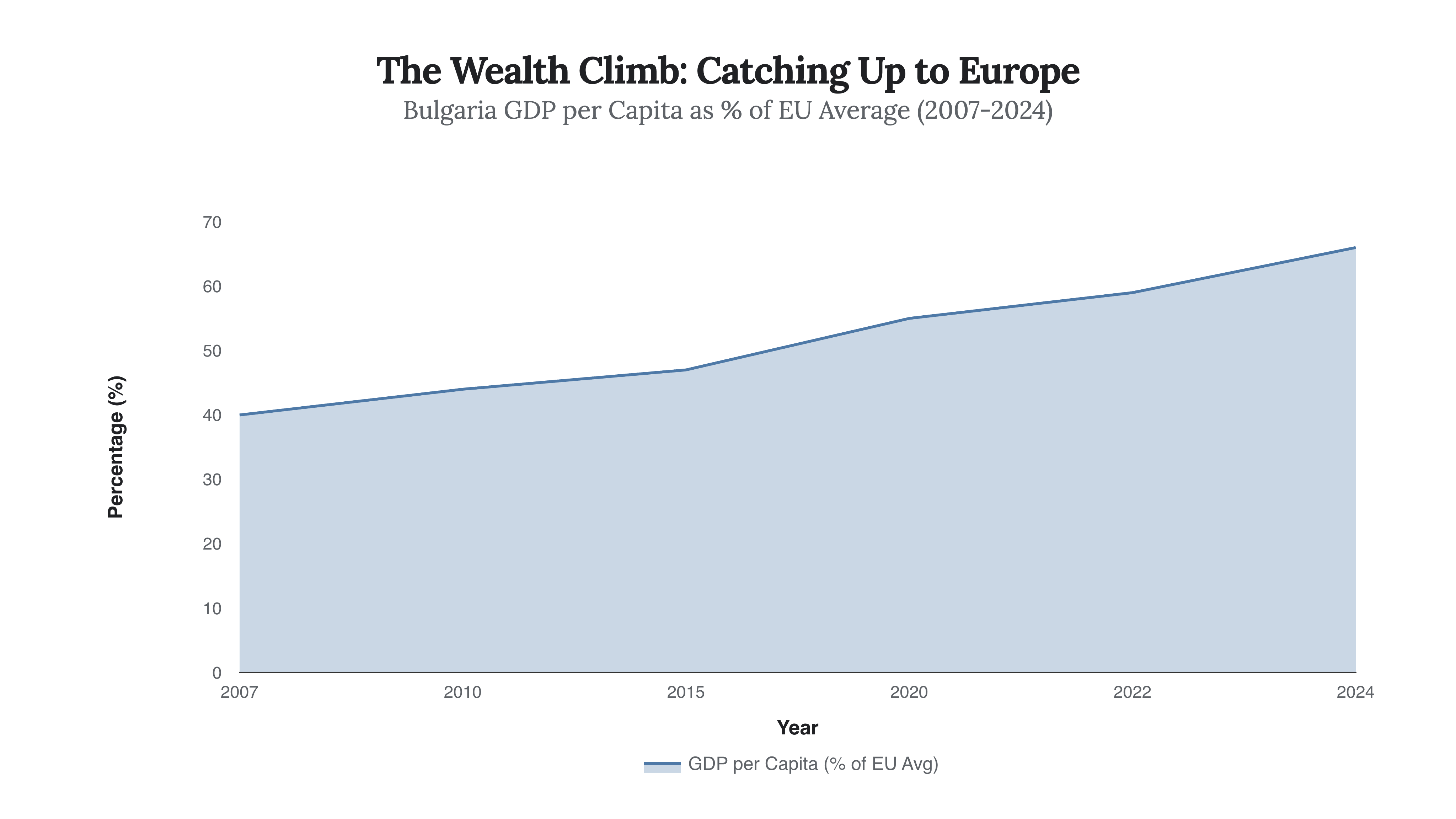 GDP per capita, which stood at a meager 40% of the EU average in 2007, has climbed to 66% as of 2024. The adoption of the euro is expected to accelerate this trend by reducing interest rates for borrowers and integrating Bulgarian businesses more deeply into the single market supply chains.