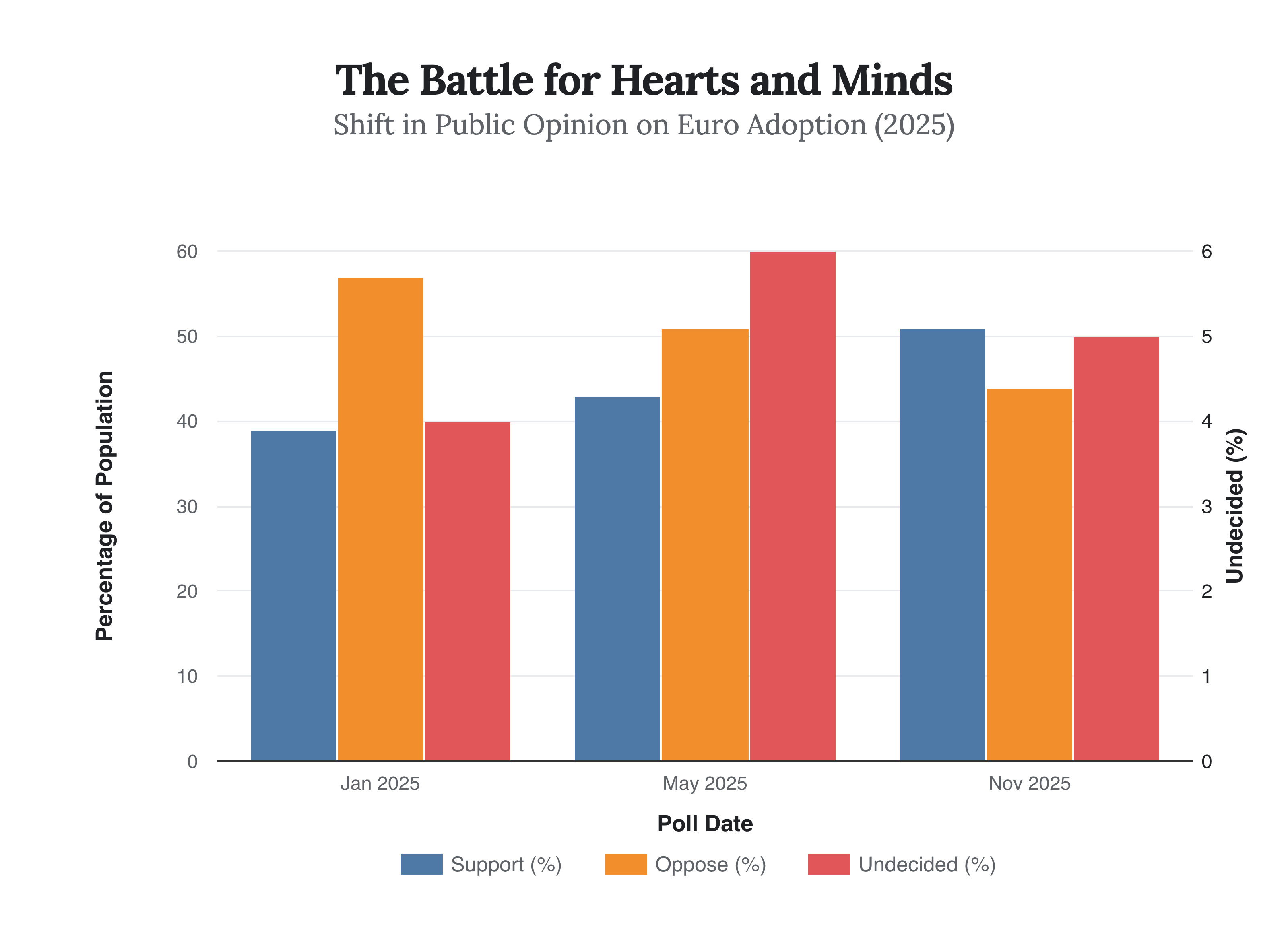 However, a massive information campaign launched in the spring of 2025 appears to have turned the tide just in time for the switch. By November, polls showed a dramatic reversal, with support climbing to 51% as the inevitability of the adoption settled in and the government guaranteed a “dual circulation” period—currently in effect until January 31—where both leva and euros are legal tender.