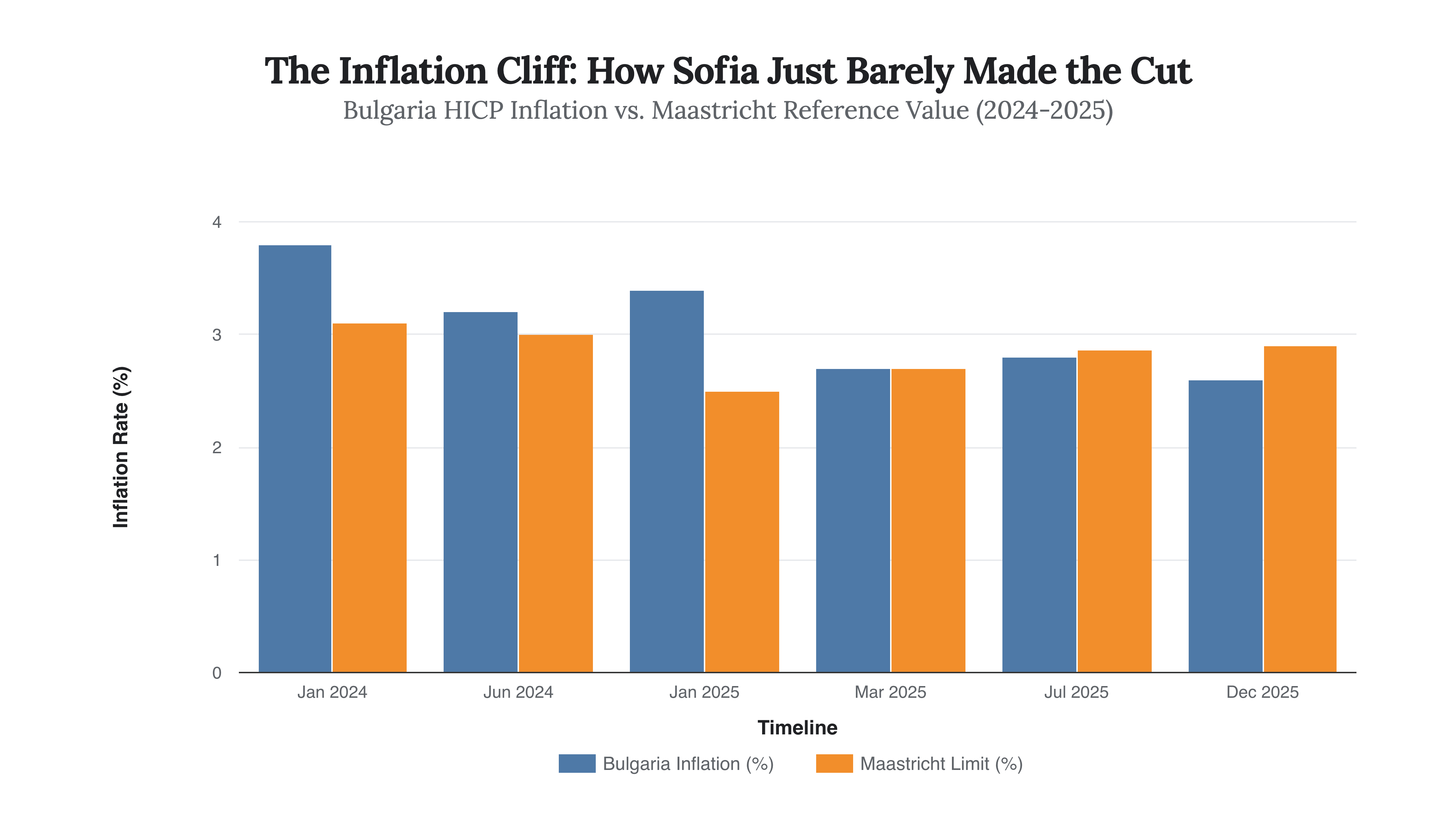 The chart above illustrates the perilous proximity of Bulgaria’s economic metrics to the disqualification line. For most of 2024 and early 2025, Sofia’s inflation remained stubbornly above the Maastricht criterion, driven by energy costs and wage hikes. It was only in March 2025—a mere four months before the final EU vote—that the country hit the magic number of 2.7%, exactly matching the reference value derived from the best-performing EU economies. This narrow margin allowed the European Commission to issue a positive convergence report in June, effectively sealing the deal.
