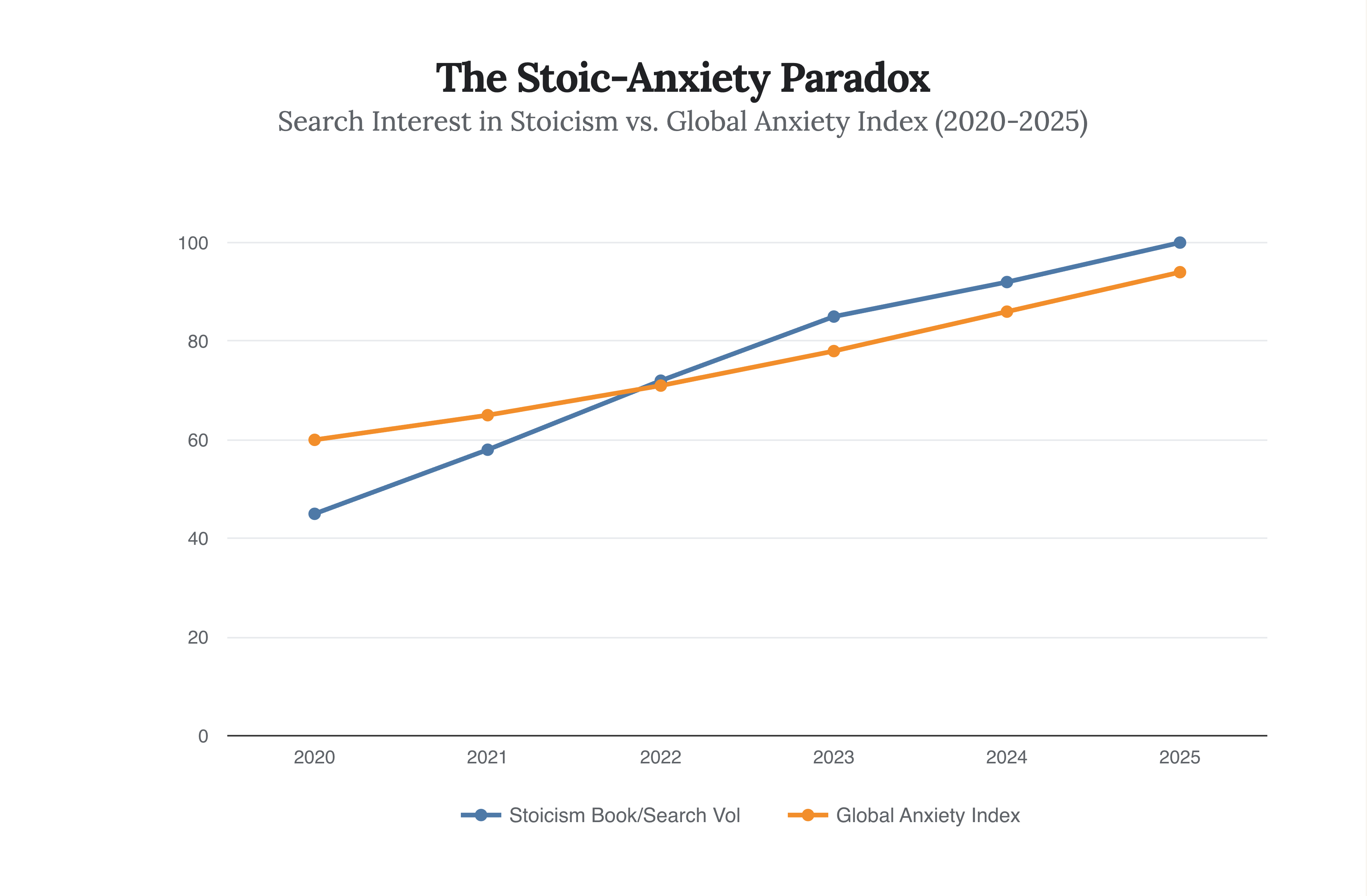 This decoupling is the smoking gun. If Stoicism were an effective antidote to the attention economy, we would expect to see an inverse correlation: as adoption of Stoic texts rises, anxiety should stabilize or fall. Instead, we see a parallel ascent. The consumption of Stoicism has become “performative resilience”—a luxury good purchased by the very demographic (Gen Z and Millennials) most ravaged by the algorithms.
