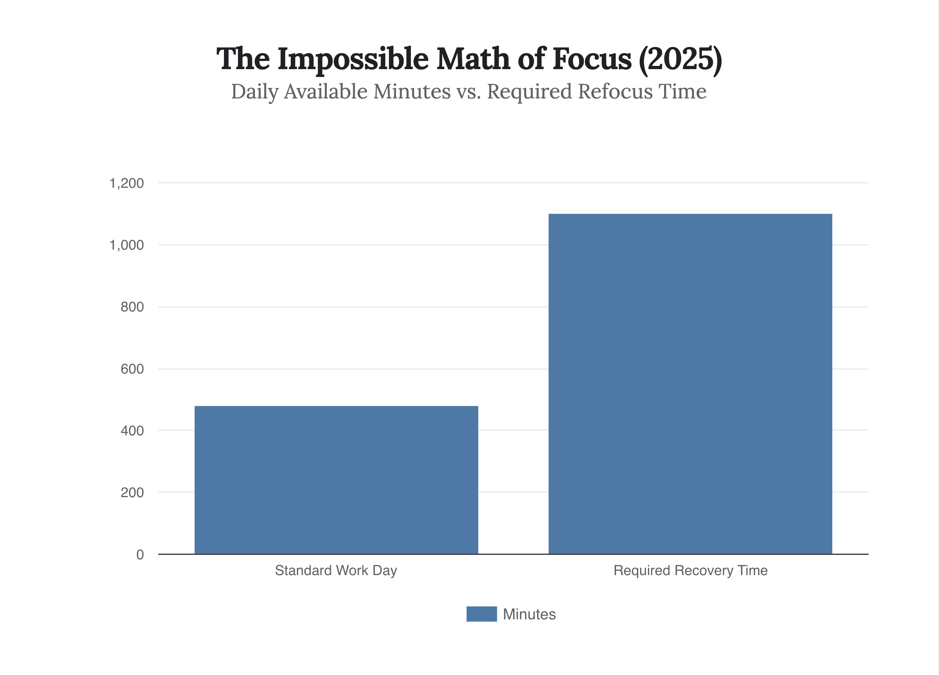 The chart above visualizes the “Cognitive Deficit.” With 275 interruptions daily, and a conservative 4-minute refocus cost (optimistic compared to Gloria Mark’s 15-minute standard), the brain requires 1,100 minutes of processing time just to return to baseline focus within a 480-minute workday. You are in cognitive debt before you open your first email.