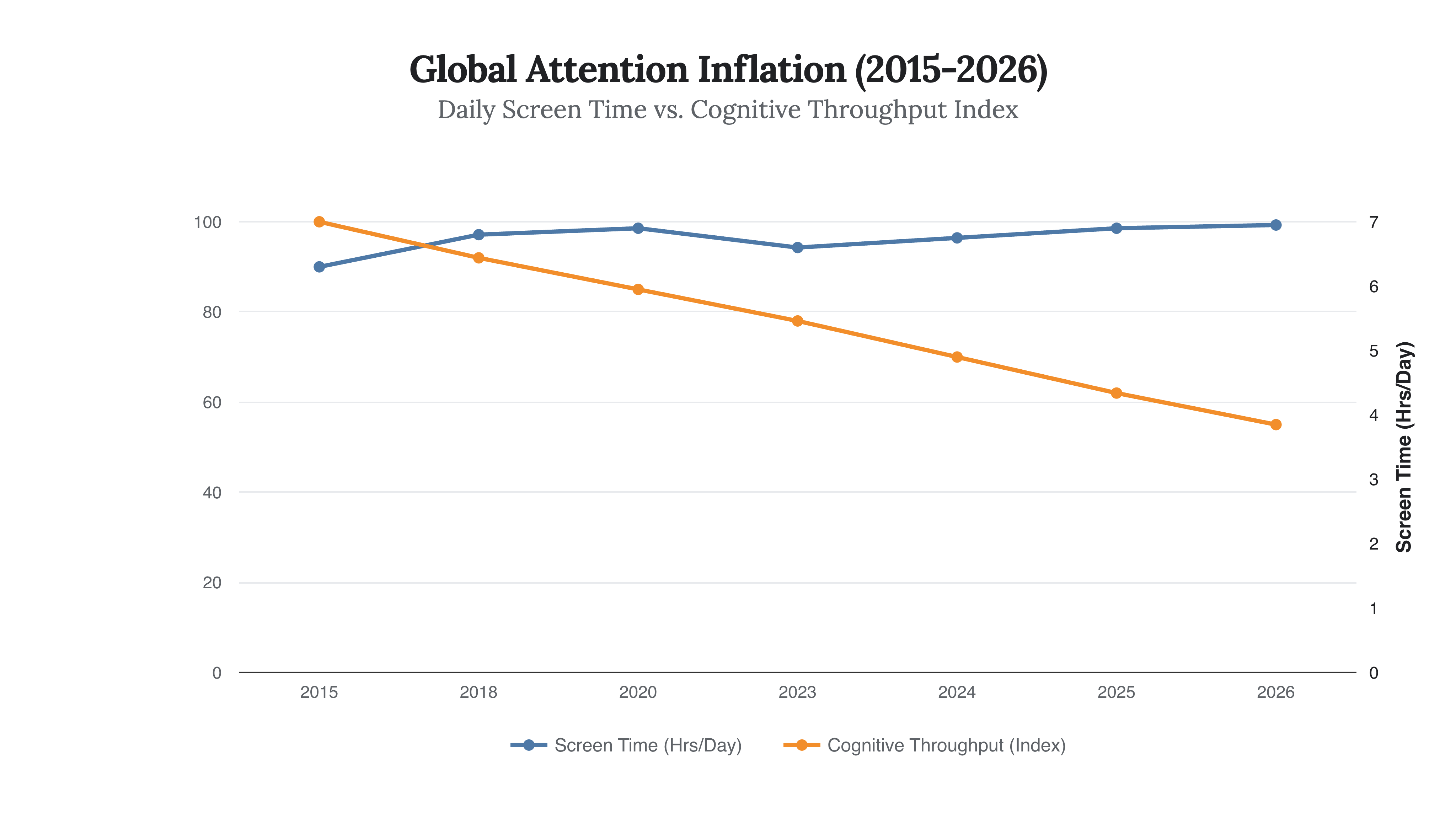The chart above reveals the inverse correlation that defines our current era. As screen time inches upward, our ability to perform cognitively demanding tasks—the “Cognitive Throughput Index”—has plummeted by 45% since 2015. We are spending more time processing low-value data and less time synthesizing high-value intelligence.
