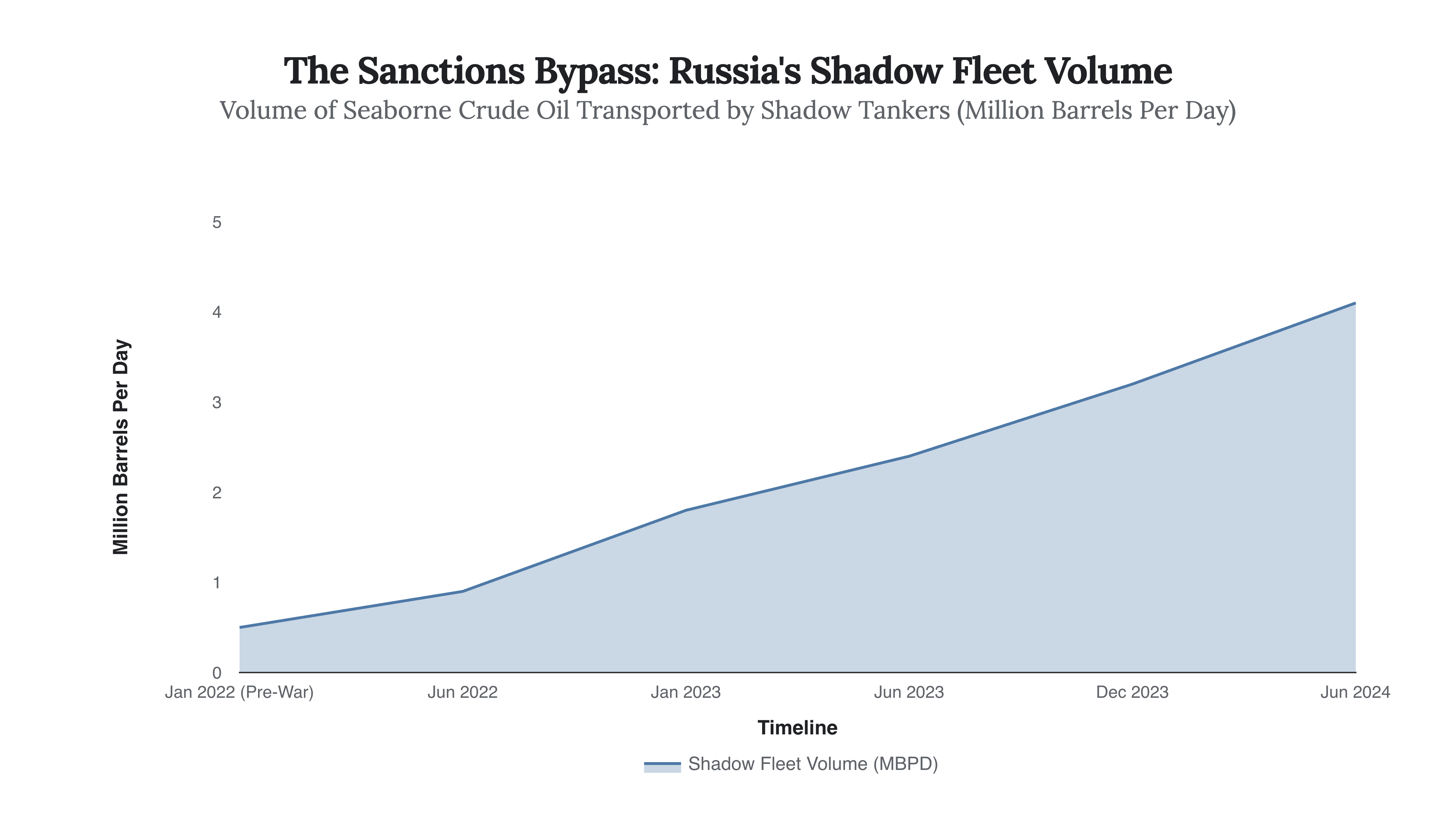 Figure 2: The Parallel Economy. Despite G7 price caps, the volume of Russian oil moved by the “Shadow Fleet” has nearly doubled in the last 18 months. By mid-2024, 70% of Russia’s seaborne oil exports were carried by these opaque vessels, effectively neutralizing the West’s primary economic weapon.