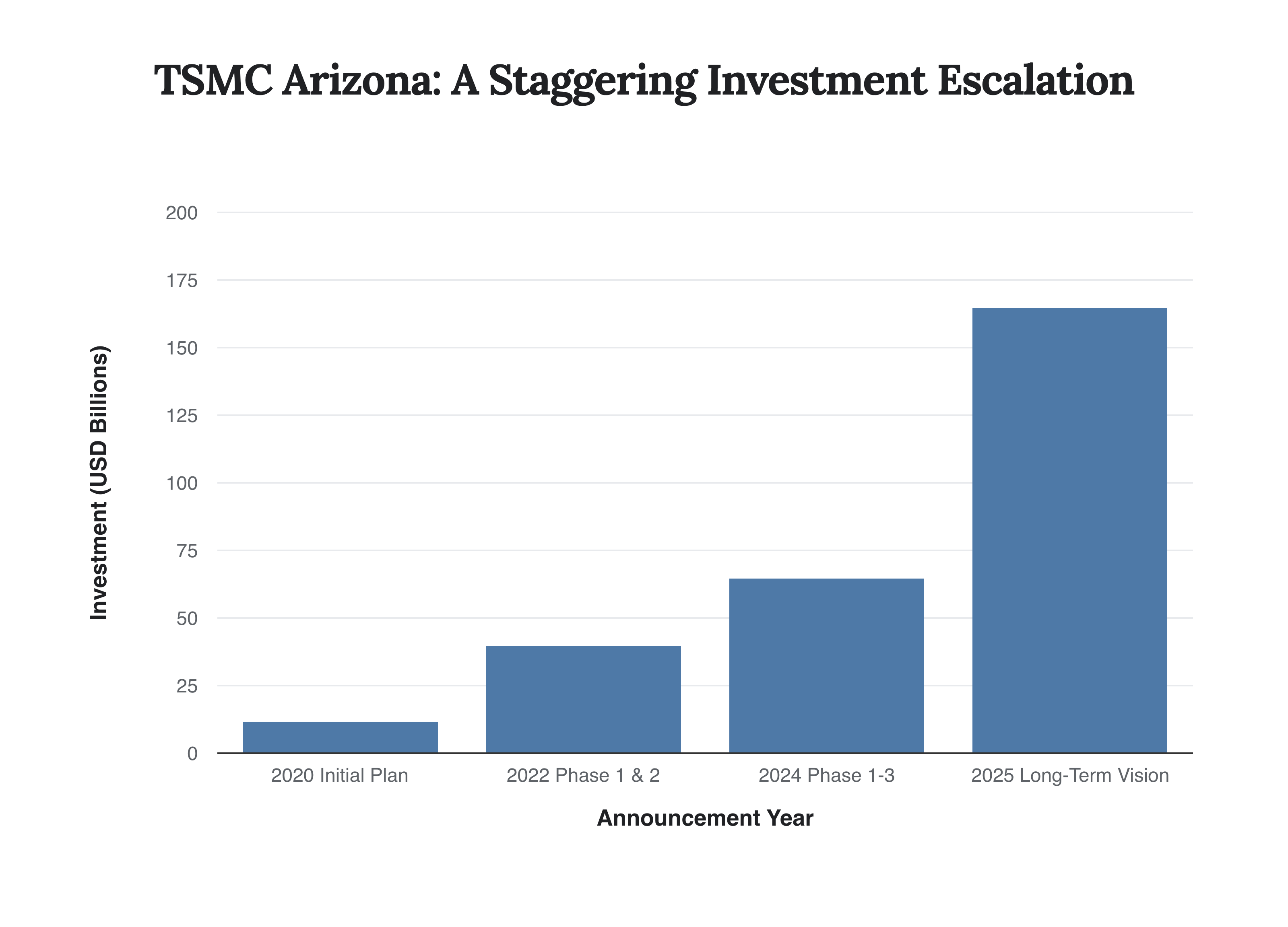 This chart illustrates the dramatic and rapid escalation of TSMC’s planned investment in its Arizona facilities, reflecting a deepening strategic commitment from both the company and the U.S. government.