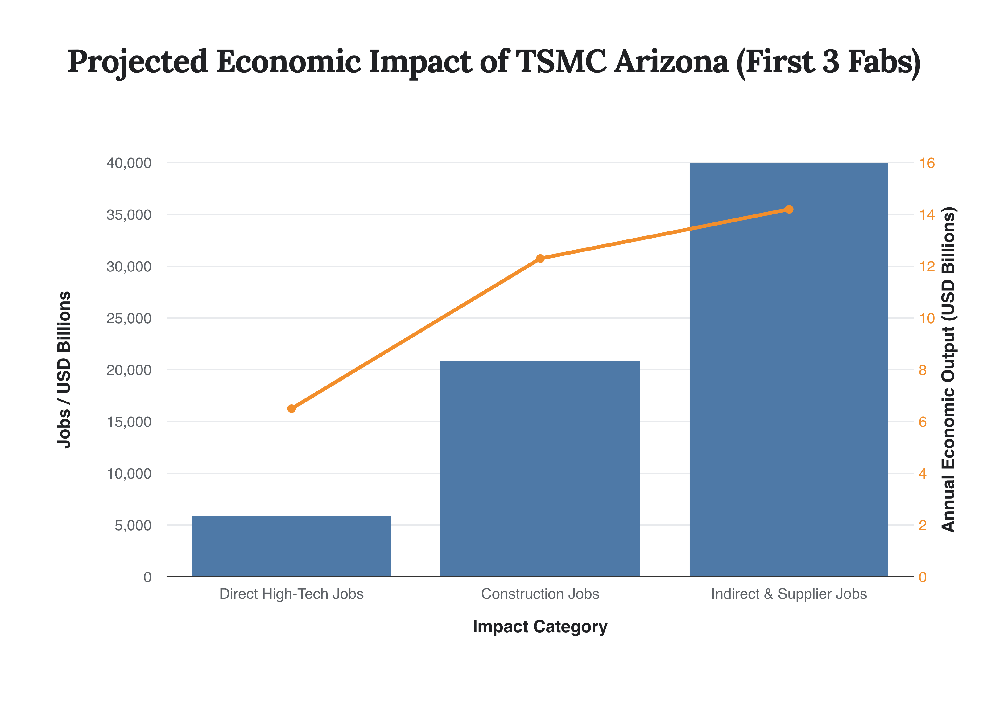 This chart visualizes the projected job creation and economic output stemming from the first phase ($65B) of TSMC’s Arizona investment, highlighting the significant local economic benefits.