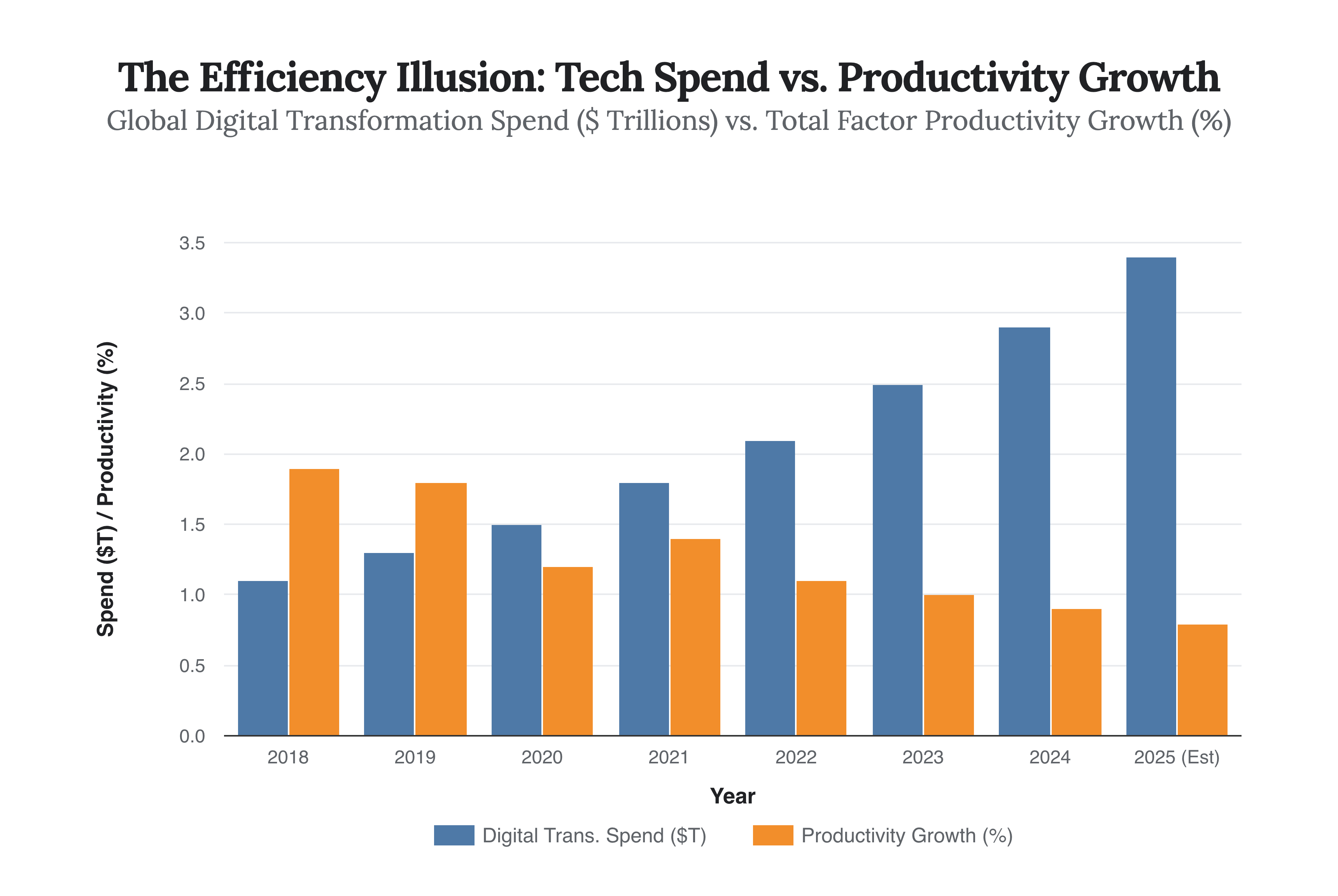 The latest intelligence paints a stark picture. Despite a projected $3.4 trillion in global digital transformation spending by 2026, global Total Factor Productivity (TFP) growth remains stubbornly stagnant, hovering near historic lows. We are spending trillions to make the wheels spin faster, but the vehicle is not moving forward. This is the Cult of Optimization—a systemic fixation on proxy metrics that has decoupled activity from value.