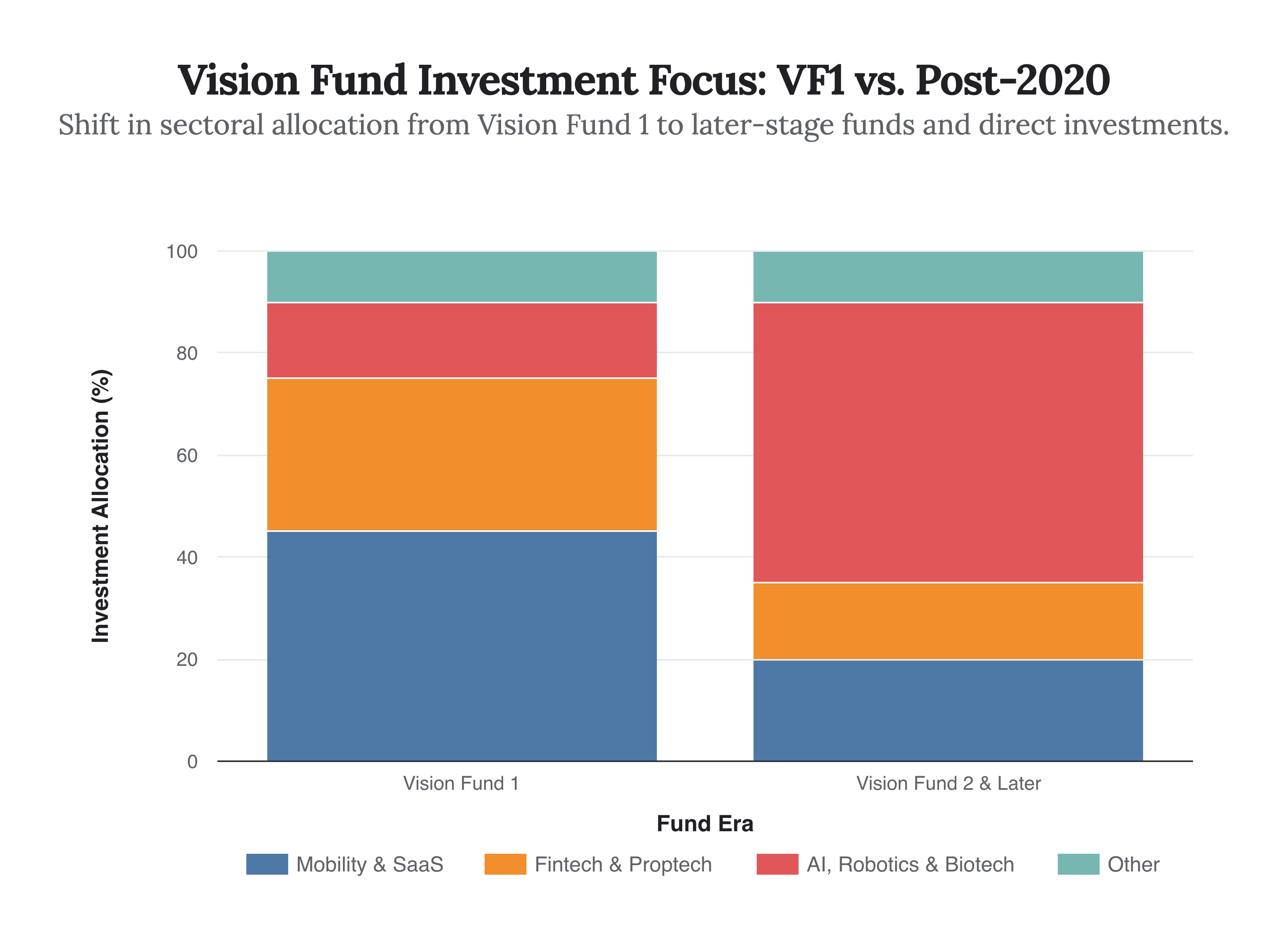 The chart shows a distinct strategic shift in SoftBank’s investment focus, with a significantly larger allocation towards deep tech and AI in its more recent funding vehicles.