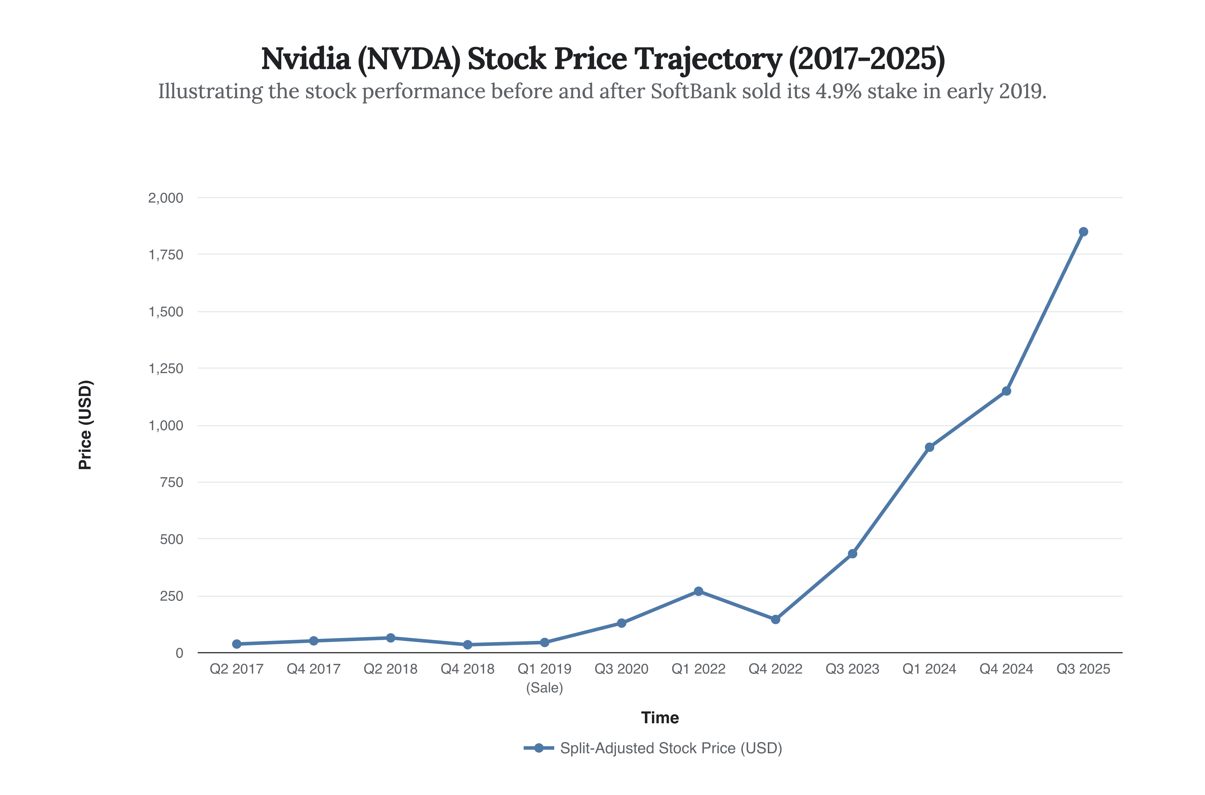 This chart traces Nvidia’s stock price, highlighting the exponential growth SoftBank missed by exiting its position in early 2019.