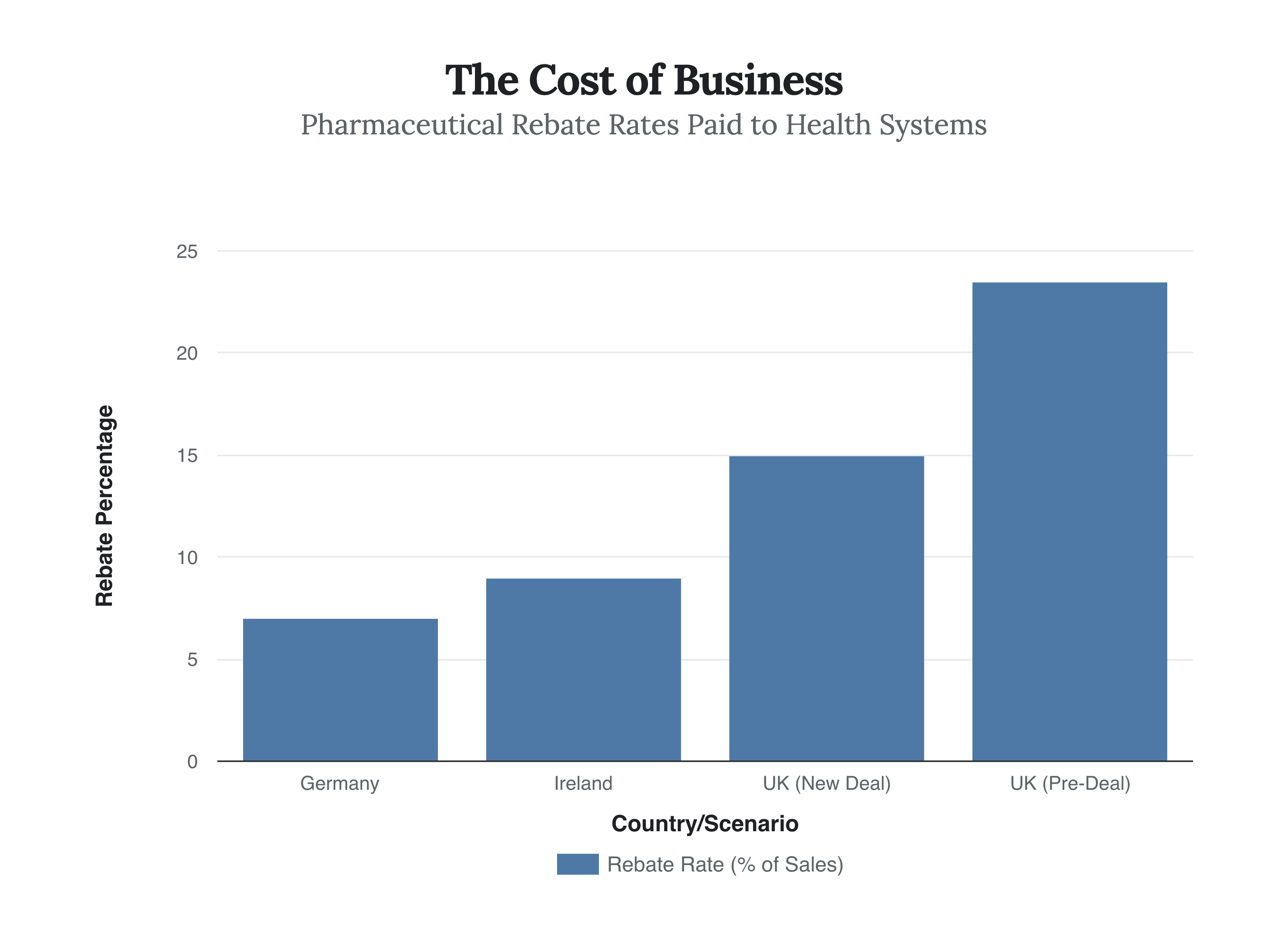 As shown in the comparison above, the UK is slashing the rebate rate—the money drug companies must pay back to the NHS if they exceed sales caps—from nearly 24% to just 15%. This aligns the UK more closely with other business-friendly European markets like Ireland and Germany, but it represents a direct loss of revenue for the NHS. Combined with the agreement to pay 25% higher net prices for new therapies, the total additional cost to the UK taxpayer is estimated at £3 billion annually.