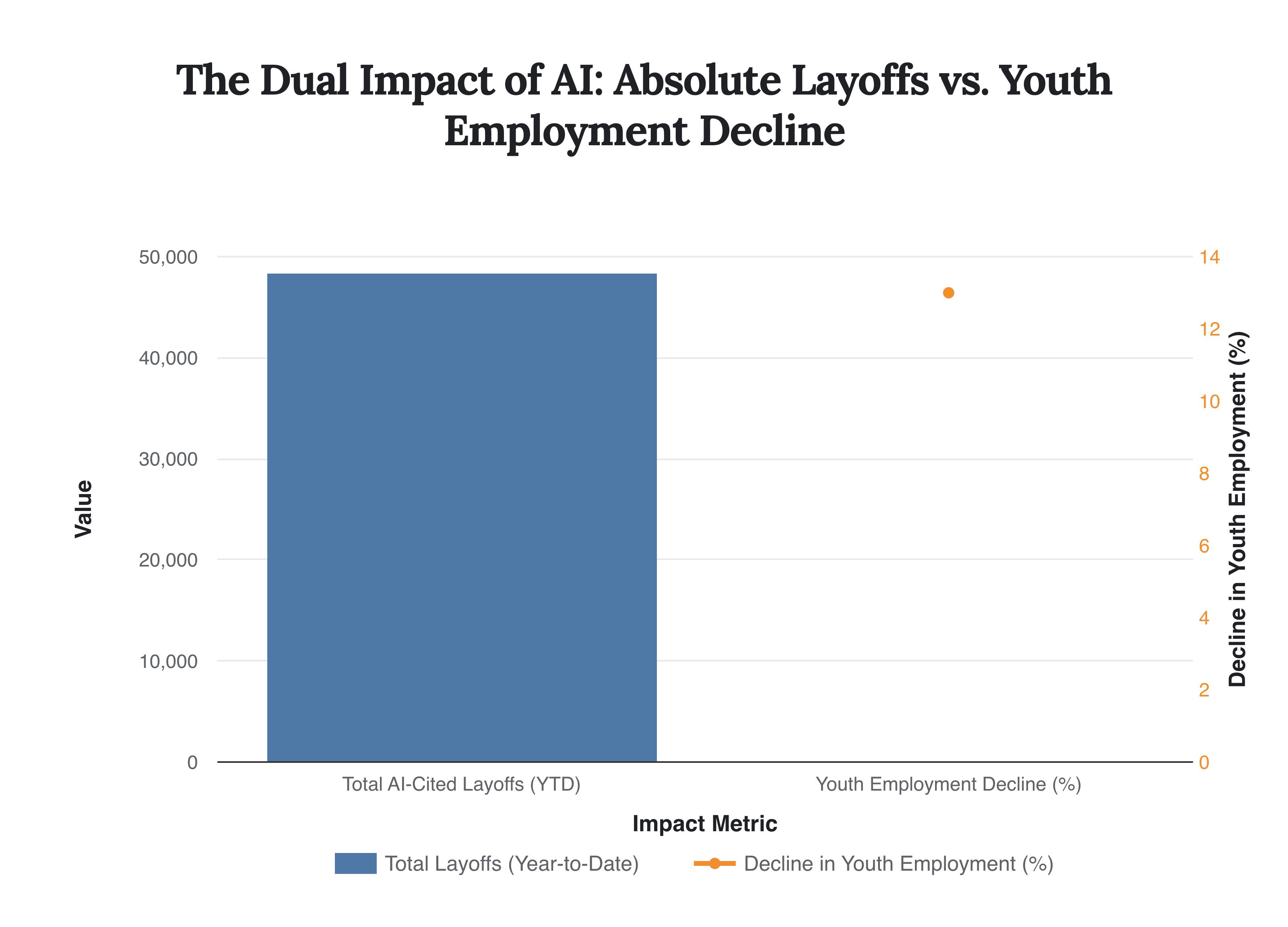 Caption: This chart juxtaposes the absolute number of AI-related layoffs in 2025 with the relative decline in employment for young workers in AI-exposed fields, highlighting two distinct but related impacts of automation on the workforce.
