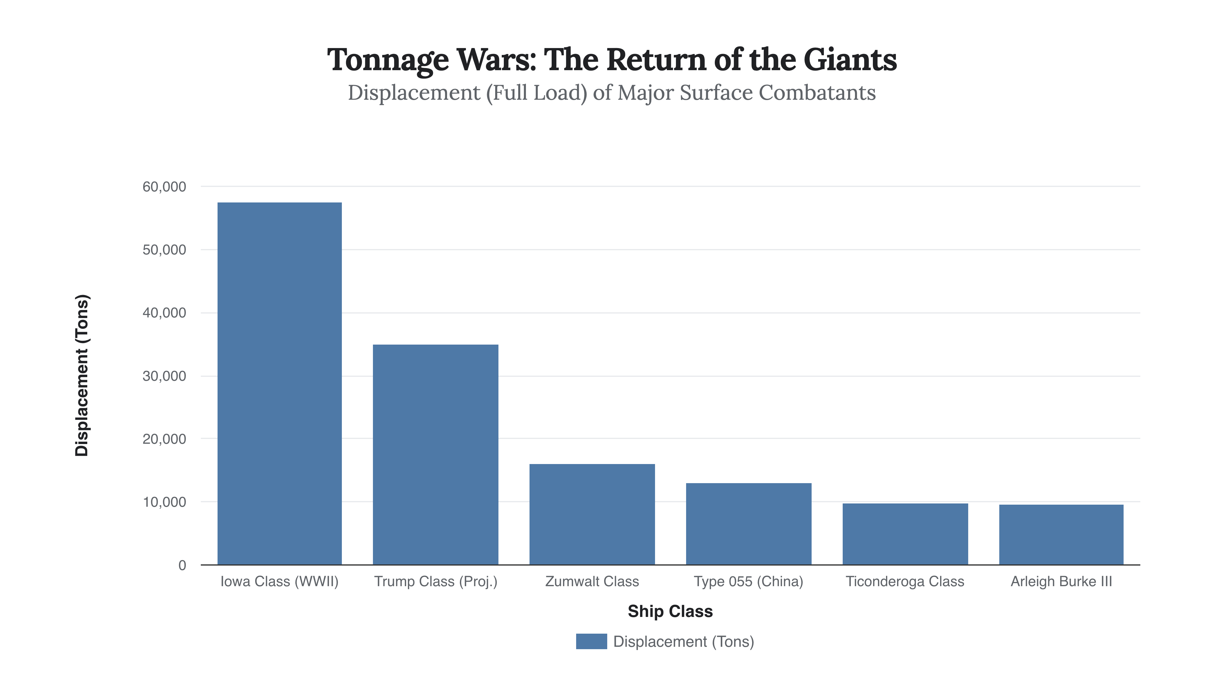 The chart above illustrates the massive scale of the proposed vessel. At 35,000 tons, the Trump class would be more than triple the size of the Navy’s current workhorse, the Arleigh Burke-class destroyer. While it does not quite reach the 57,000-ton displacement of the retired Iowa class, it dwarfs every other surface combatant currently afloat, including China’s formidable Type 055 Renhai-class cruiser. This extra tonnage is dedicated to power generation for directed energy weapons, massive magazines for hypersonic missiles, and the aforementioned armor plating—a feature absent from naval architecture for decades.