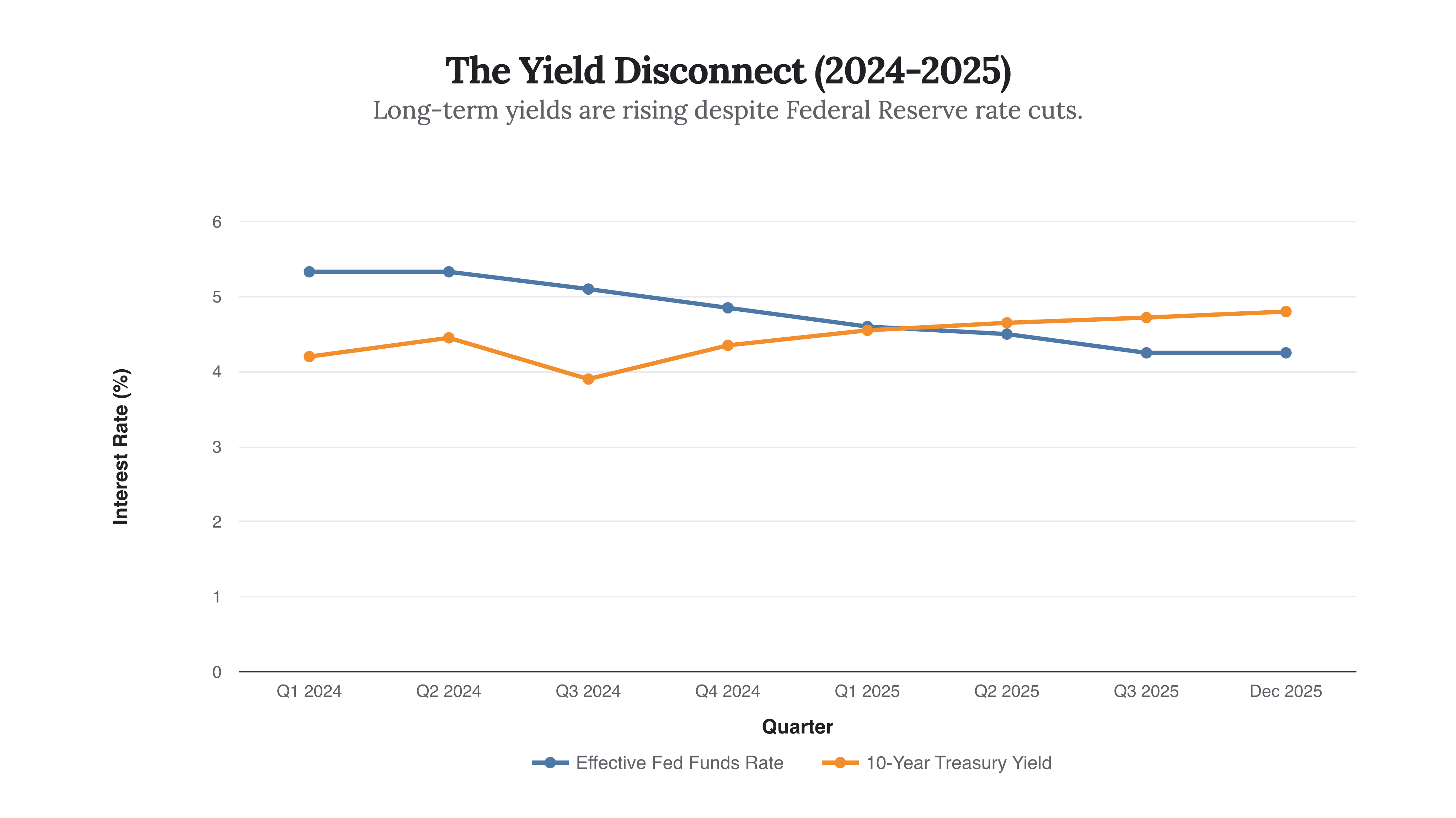 The divergence shown above is the heart of the warning. Even as the Fed lowered the baseline cost of borrowing (the blue line), the market forced the yield on 10-year notes (the green line) higher. This signals that the market is losing faith in the long-term suppression of rates.