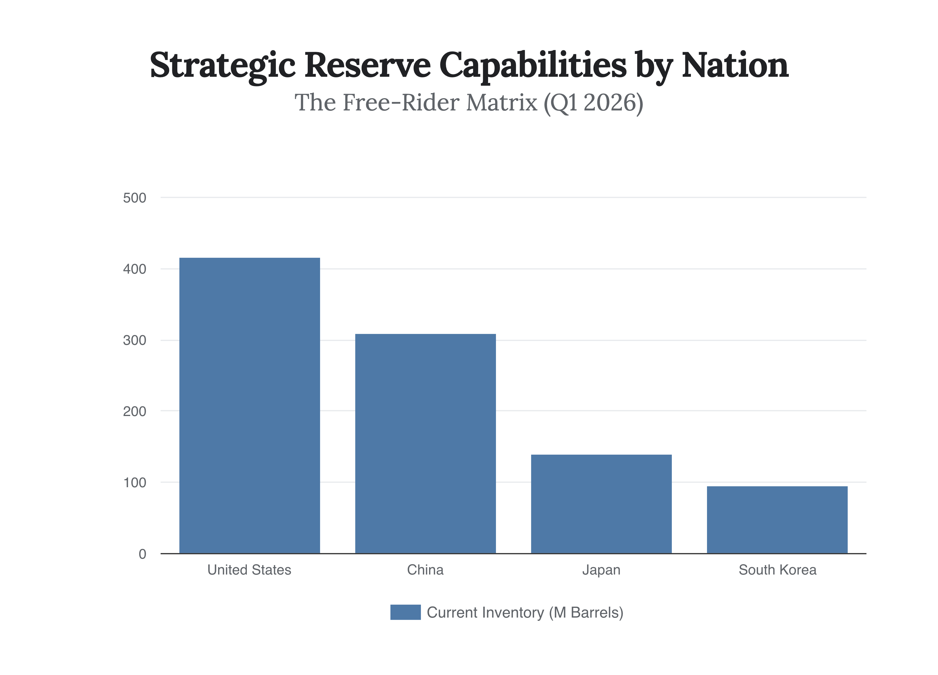 In Game Theory, this is the textbook definition of the “Free-Rider Problem.” China heavily relies on Middle Eastern crude flows, making it highly vulnerable to the Strait of Hormuz closure. Yet, Beijing’s optimal strategy is to do absolutely nothing. By allowing Washington, London, and Tokyo to deplete their emergency reserves to crush the price of crude, China secures the macroeconomic benefit of lower energy input costs for its manufacturing base without exposing its own strategic inventory to depletion. Beijing’s strategic patience in this crisis represents the ultimate free-rider exploit, absorbing the economic subsidies of Western reserve depletion without sacrificing a single barrel of its own strategic stockpile.