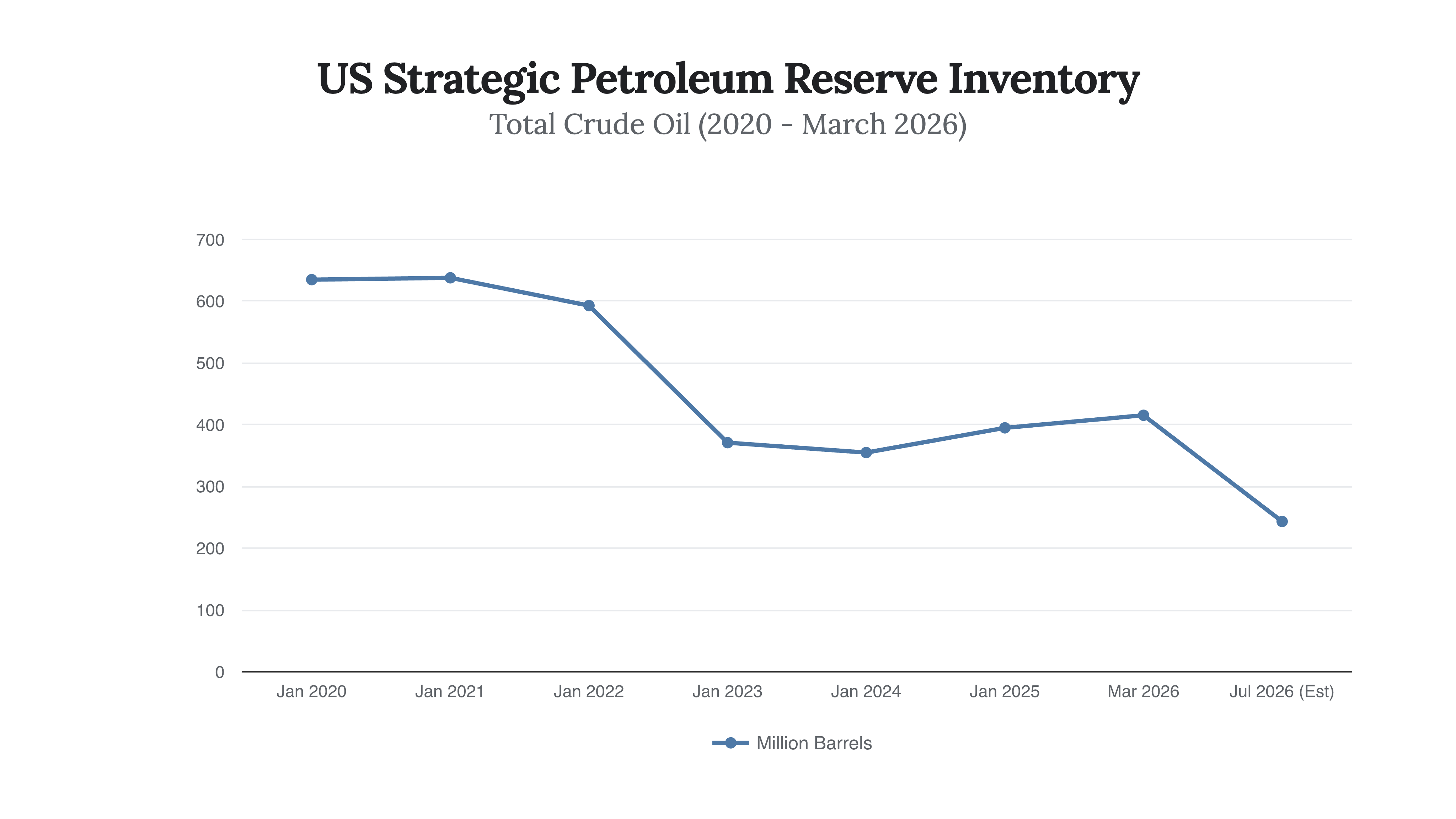 As of late February 2026, the U.S. SPR held precisely 415.4 million barrels of crude, operating at a heavily depleted 58% of its authorized 714-million-barrel capacity. This operational level was the legacy of the 180-million-barrel drawdown executed in 2022 following the Russian invasion of Ukraine, alongside systemic delays in the refill process throughout 2024 and 2025. Authorizing a 172-million-barrel release from a baseline of 415.4 million is a high-stakes gamble. It effectively halves the nation’s remaining emergency buffer, plummeting the reserve down to an estimated 243.4 million barrels by mid-summer 2026. The weaponization of emergency reserves has evolved from a mechanism of domestic price stabilization into the ultimate economic counter-offensive in modern hybrid warfare.