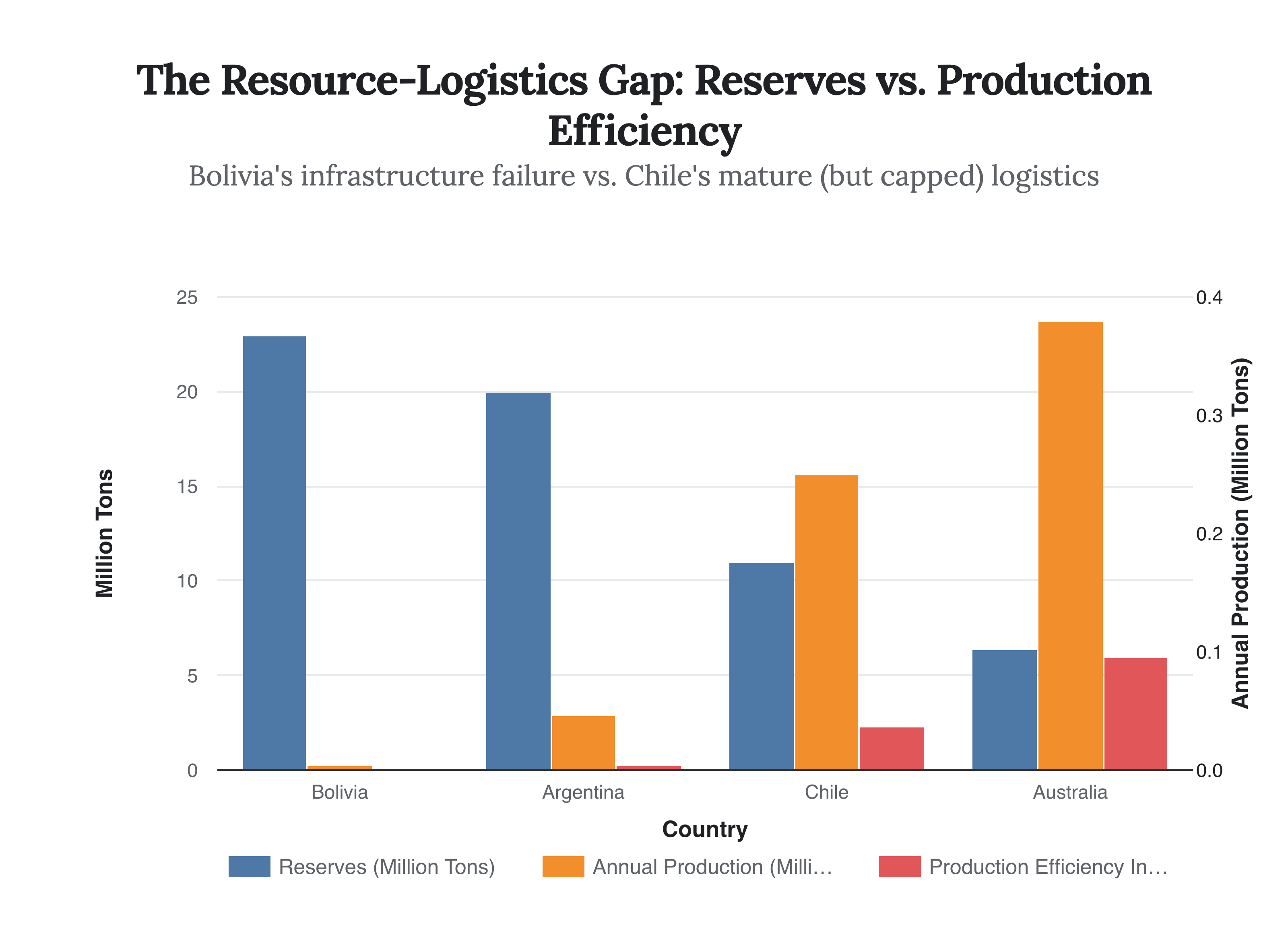 The chart above illustrates a critical strategic insight: Reserves are meaningless without rails. Australia, with a fraction of the Triangle’s reserves, dominates production largely due to its proximity to ports and established mining infrastructure. Bolivia’s “efficiency index” is near zero, a direct quantifiable result of its logistical isolation.
