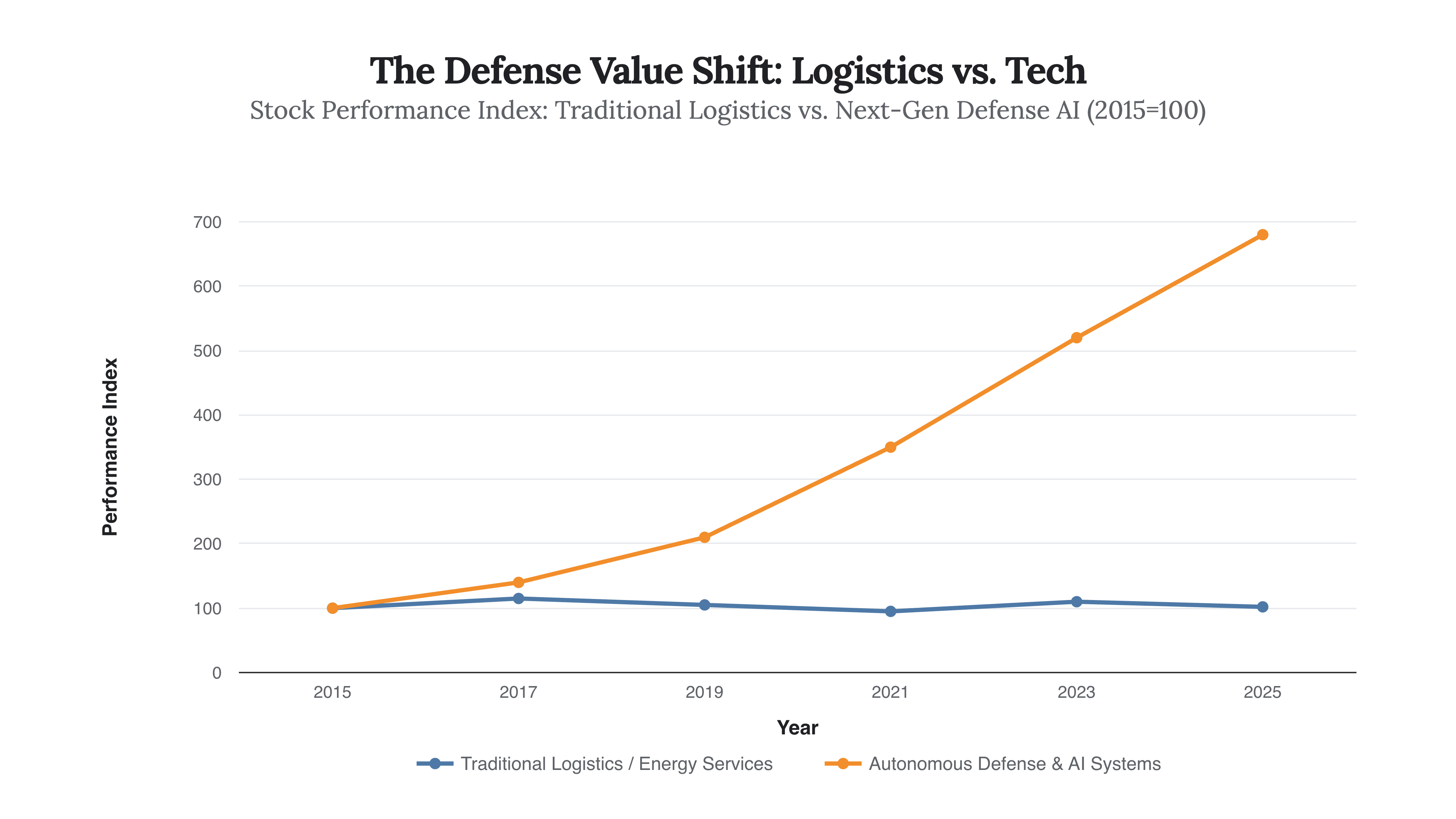 One cannot analyze Cheney’s legacy without addressing the financial architecture he helped build. The “War on Terror” economy created a distinct class of defense beneficiaries. The market’s reaction to the end of the Cheney era has been telling. While defense primes remain robust, the specific “nation-building” sector has seen a secular decline, replaced by the “great power competition” tech stack. The chart below tracks the divergence between traditional defense logistics (Halliburton-era style) and modern autonomous defense tech.