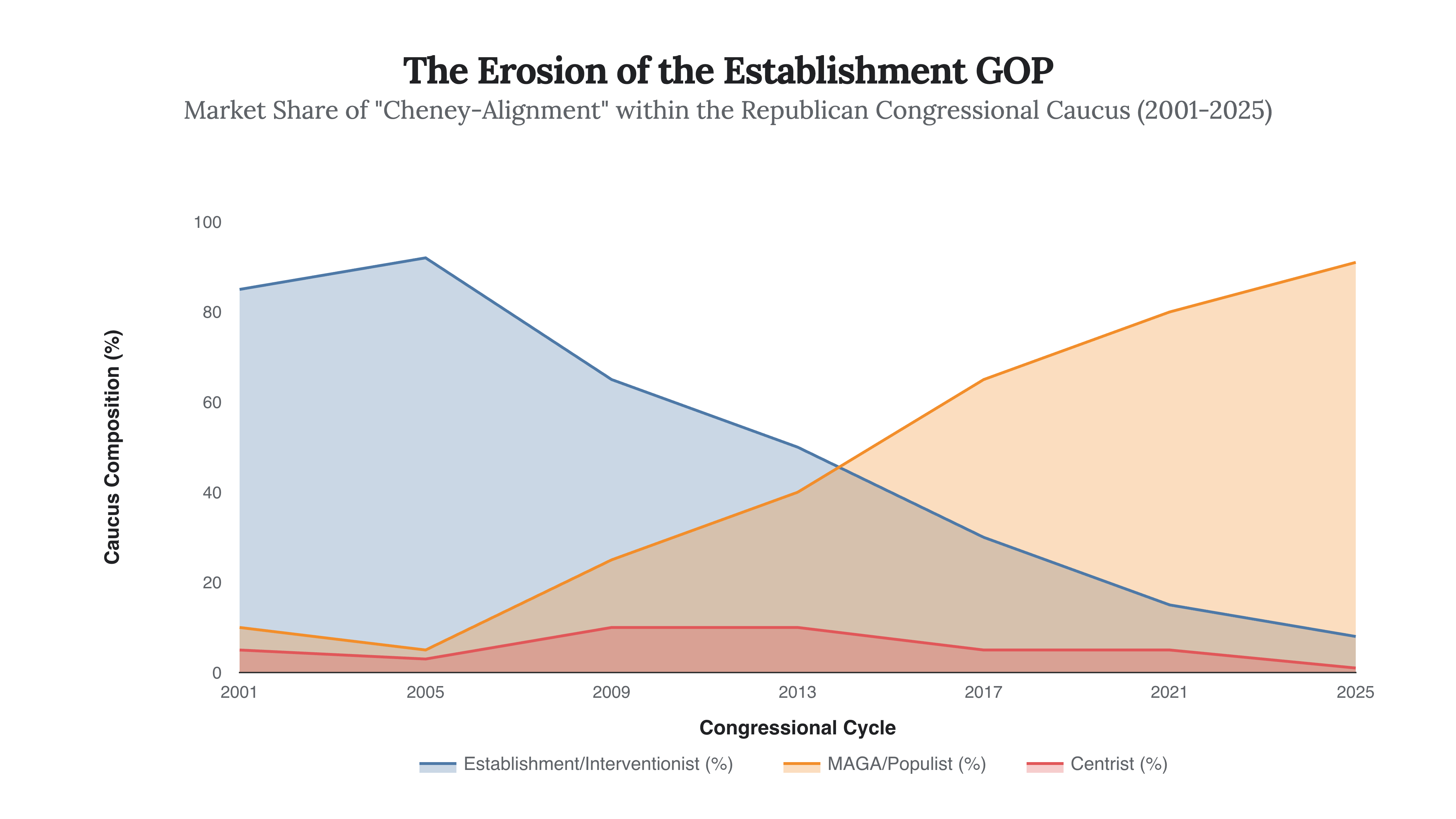 Dick Cheney’s passing marks the definitive end of the Neoconservative era, a period defined by interventionist foreign policy and executive expansionism. However, the funeral highlighted how the remnants of this ideology have migrated. The “Cheney Wing” of the GOP has not disappeared; it has been absorbed into a broader anti-populist coalition that now includes centrist Democrats. The data below reveals the collapse of the “Bush-Cheney Republican” as a distinct electoral force and its transformation into a niche elite faction.