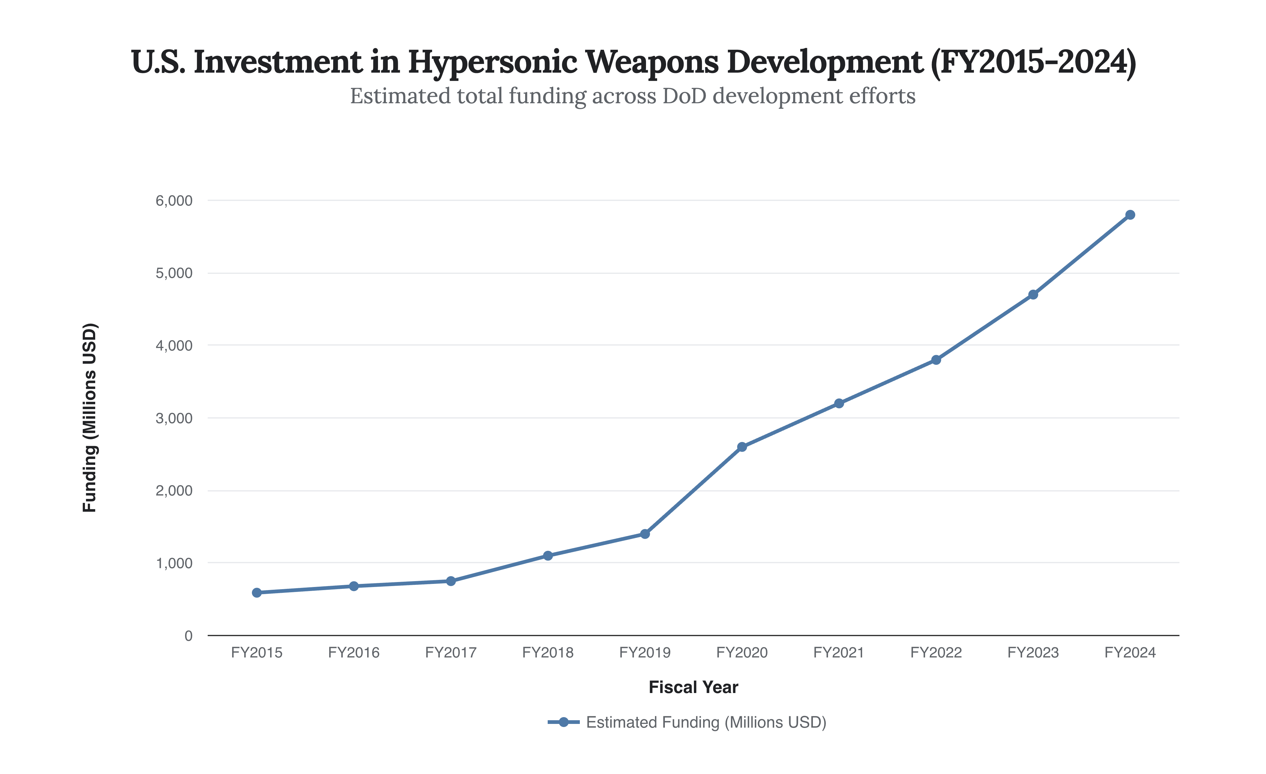 Caption: The chart displays the significant ramp-up in estimated U.S. funding for hypersonic weapons development, culminating in a near-$15 billion investment over a decade, which underpins the new strategic push to scale production.