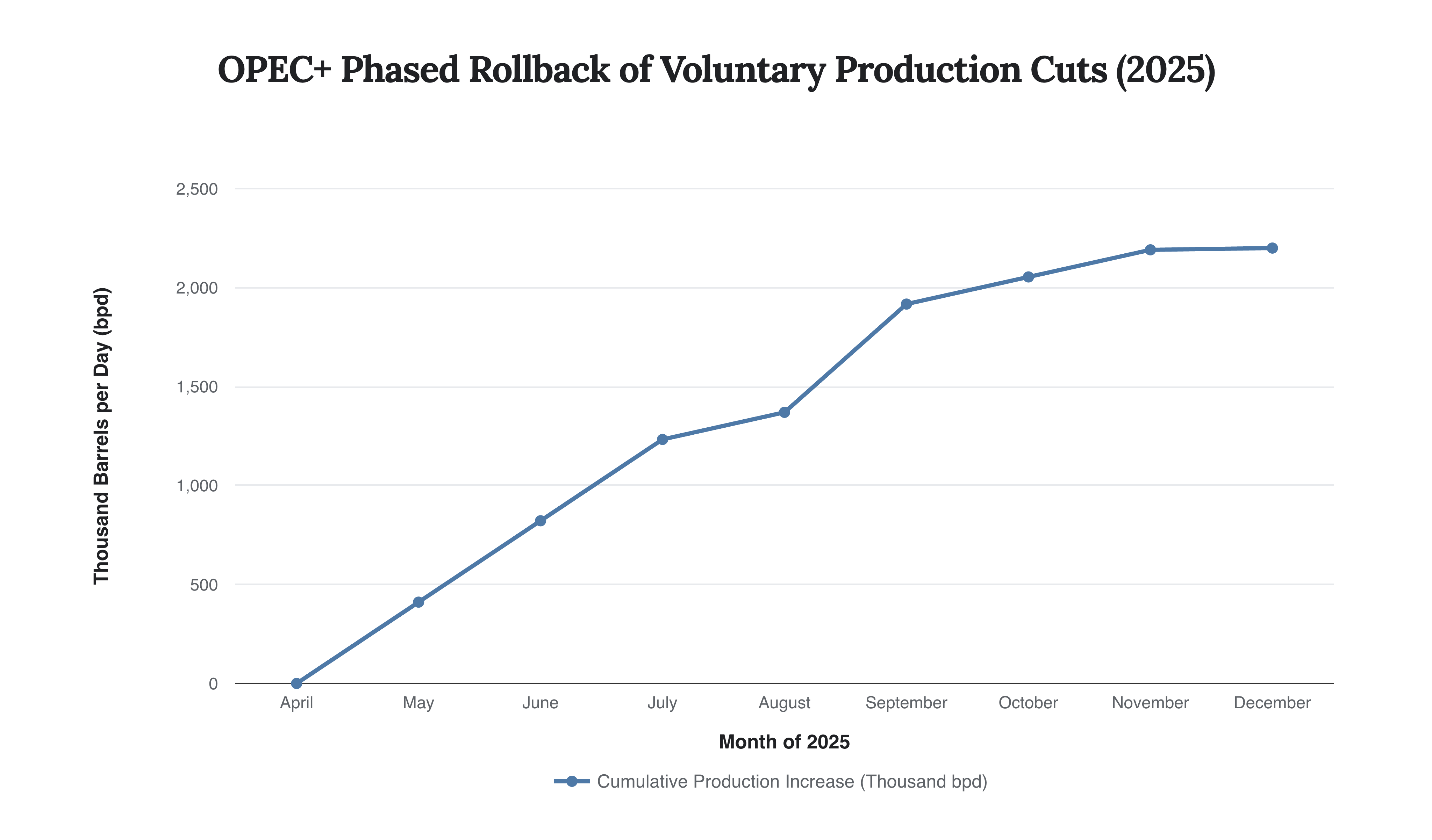 Caption: This chart illustrates the planned cumulative increase in oil production by the eight core OPEC+ members throughout 2025 as they begin to unwind their 2.2 million bpd voluntary cuts.