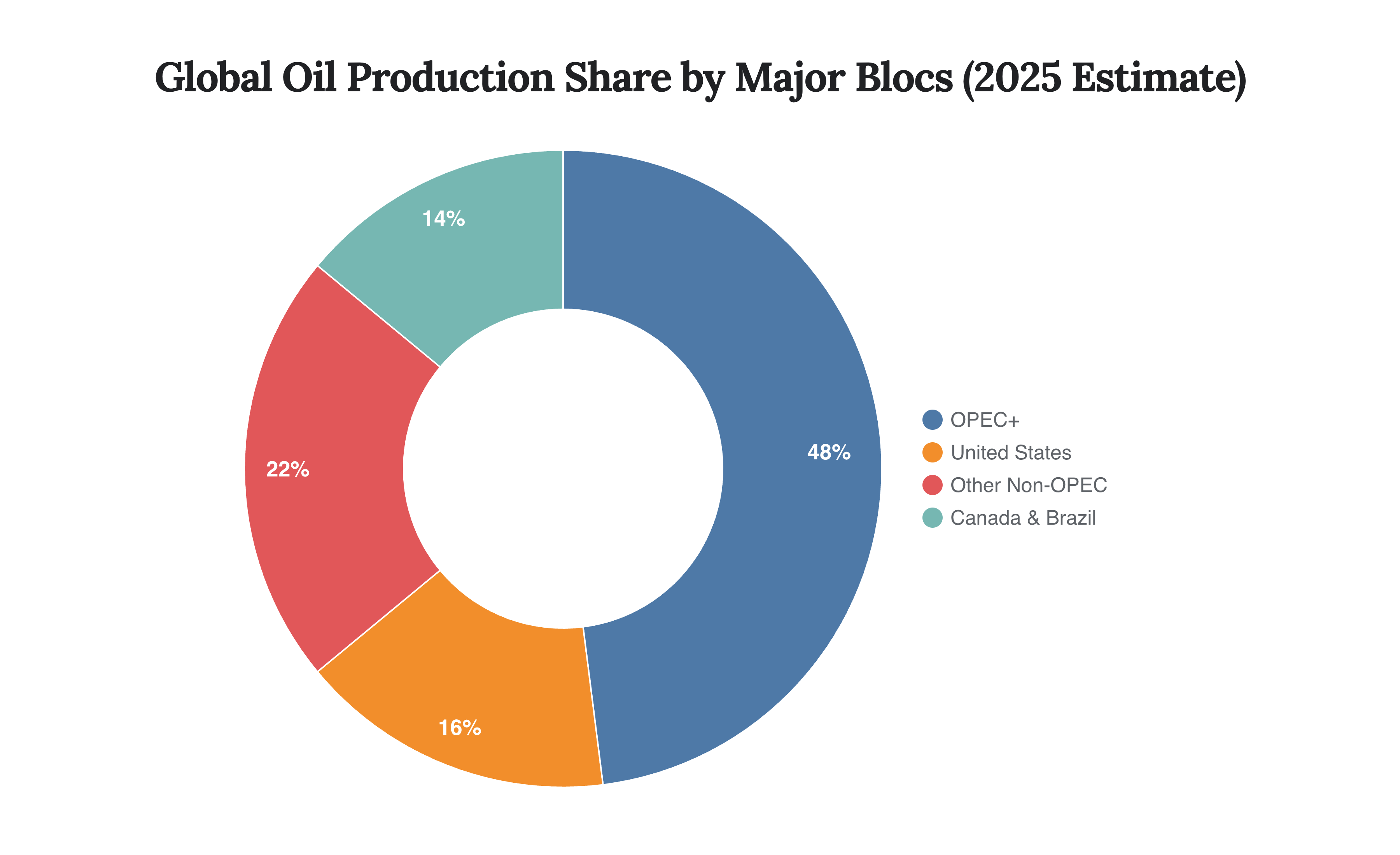 Caption: This chart shows the estimated breakdown of global oil production, underscoring the dominant 48% market share held by the OPEC+ alliance, which it seeks to defend and expand.