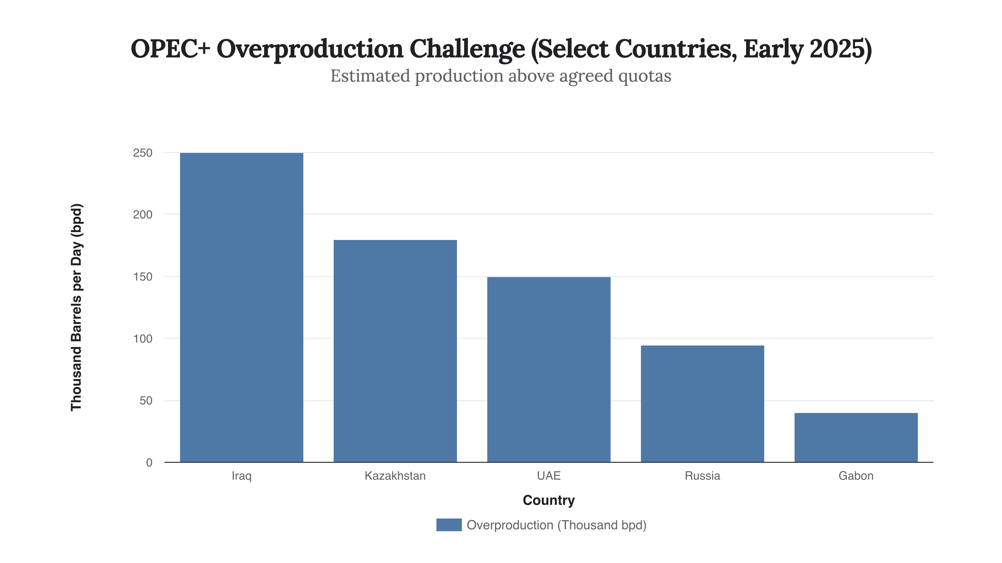Caption: This chart highlights the persistent issue of overproduction within the alliance, showing estimated output above quotas for key members in early 2025, a challenge the group is actively trying to manage.