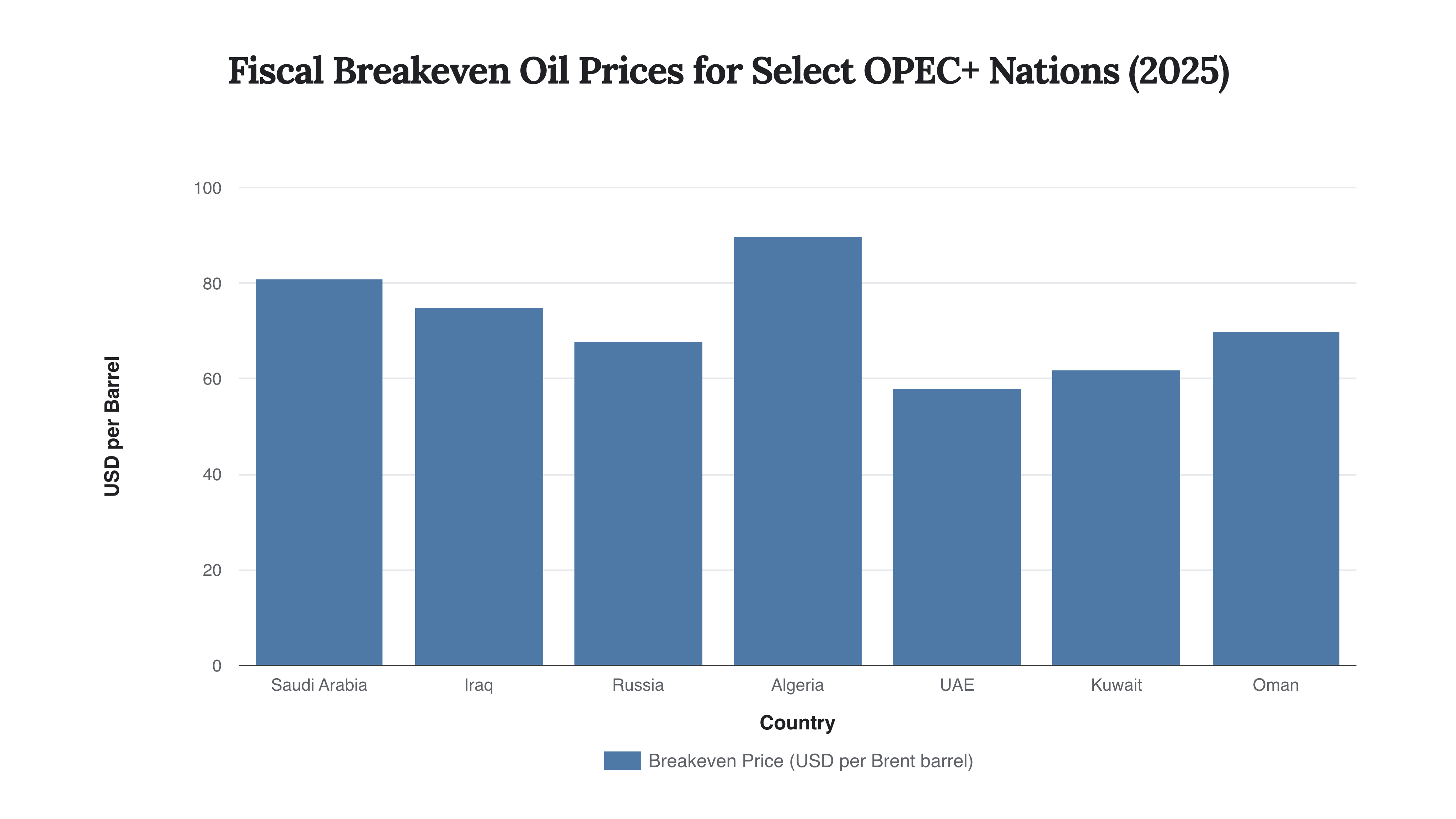 Caption: The wide range of fiscal breakeven oil prices among key OPEC+ members in 2025 illustrates the internal economic pressures that influence the group’s collective production decisions.