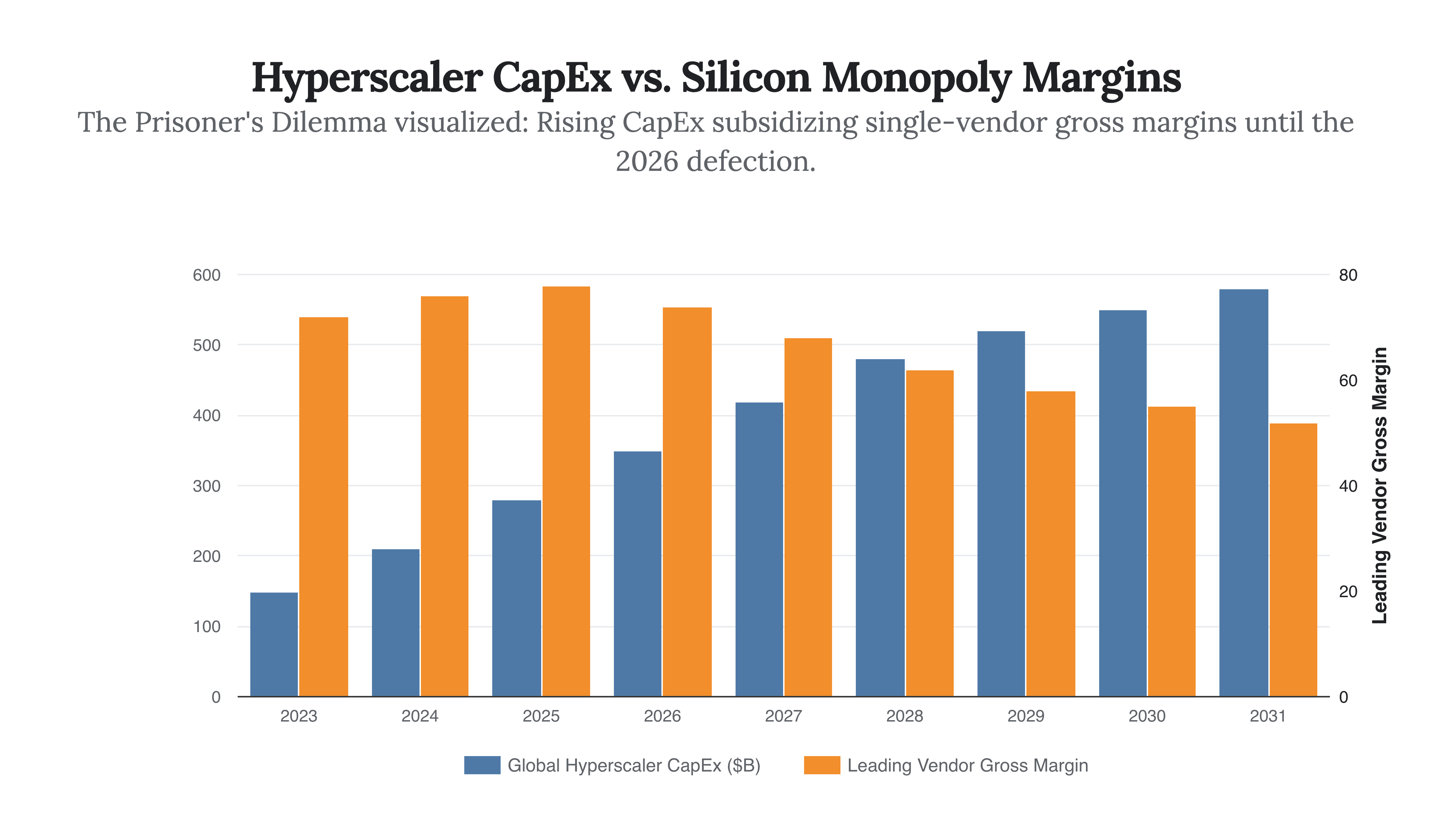 This dynamic created a pathological wealth transfer. Hyperscalers were expanding their capital expenditure (CapEx) budgets at an unsustainable velocity, with Meta alone projecting between $115 billion and $135 billion in infrastructure spend for the 2026 fiscal year. In a deeply asymmetric Zero-Sum Game, all the surplus value generated by the promise of AI was being captured not by the entities building the applications, but by the supplier of the foundational compute. The supplier was reporting gross margins exceeding 75%, an economic anomaly that screamed of unchecked monopoly power. The hyperscalers were cannibalizing their own balance sheets to subsidize the historic market capitalization of their vendor.