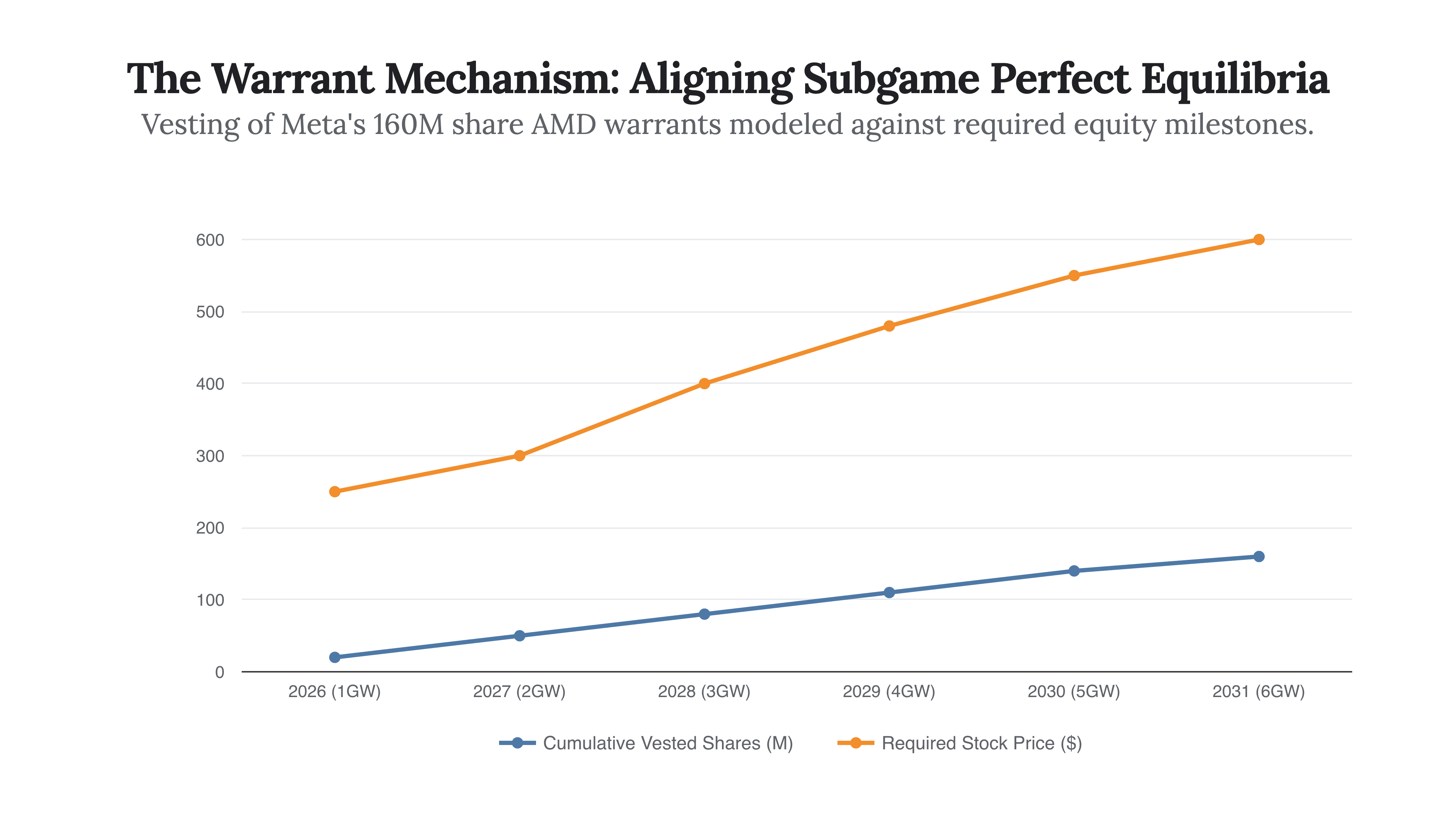 The solution was a performance-based warrant structure. AMD issued Meta the right to acquire up to 160 million shares of AMD common stock—roughly 10% of the company—at an exercise price of a singular penny ($0.01) per share. However, these warrants were heavily tranched, vesting only as rigorous, gigawatt-scale shipment milestones were achieved, and critically, requiring AMD’s stock price to hit escalating targets up to an astonishing $600 per share. (This mirrored a similar “circular transaction” AMD pioneered with OpenAI in October 2025, revealing a conscious strategy by AMD’s leadership to utilize corporate equity as a weapon to secure absolute hyperscaler loyalty).