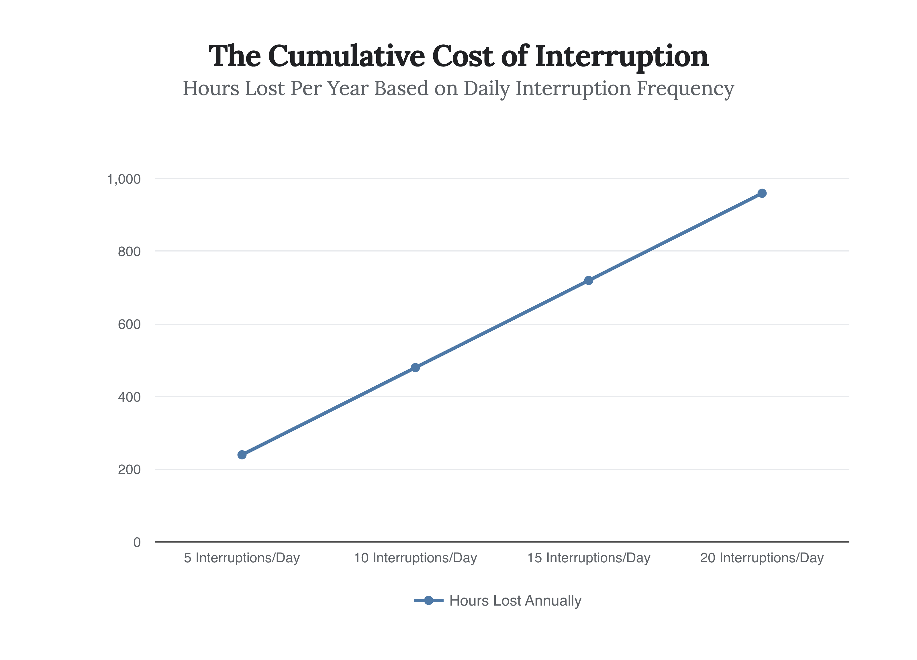 The chart above visualizes the cumulative impact. At a modest 15 significant interruptions per day (where recovery time is required), an employee loses approximately 720 hours a year—roughly 30% of a standard work year—to the “Refocus Lag.” This is the invisible leak in the hull of the global economy.