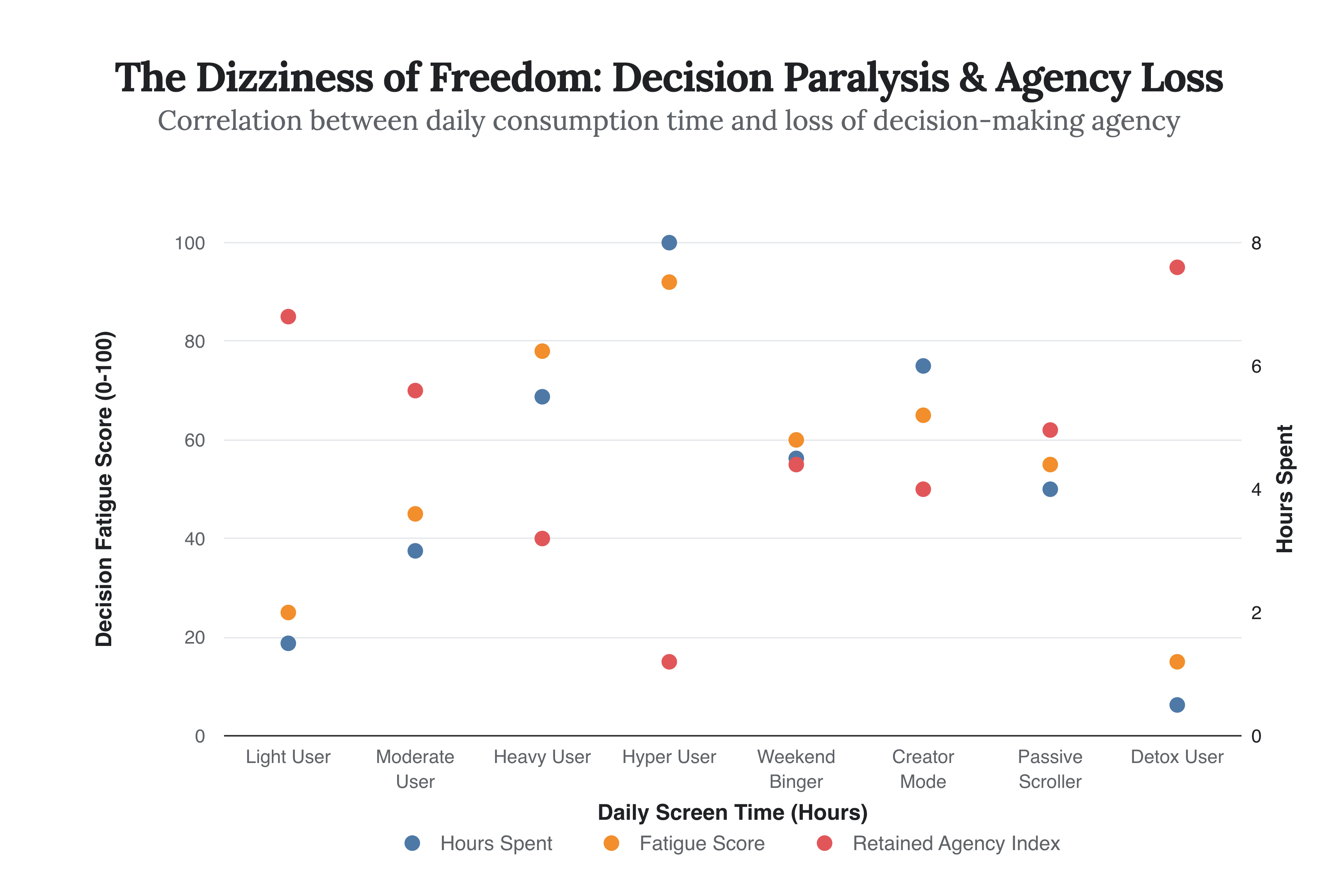 The chart above illustrates the inverse relationship between consumption and agency. As screen time escalates towards the 4+ hour mark (typical for 35% of Gen Z), decision fatigue spikes and “Agency”—the ability to act according to one’s own will—collapses. The algorithm steps in to fill this void, dictating everything from purchasing decisions to political affiliation. This is the “sickness”: a will that refuses to will itself, preferring the comfortable numbness of the feed.