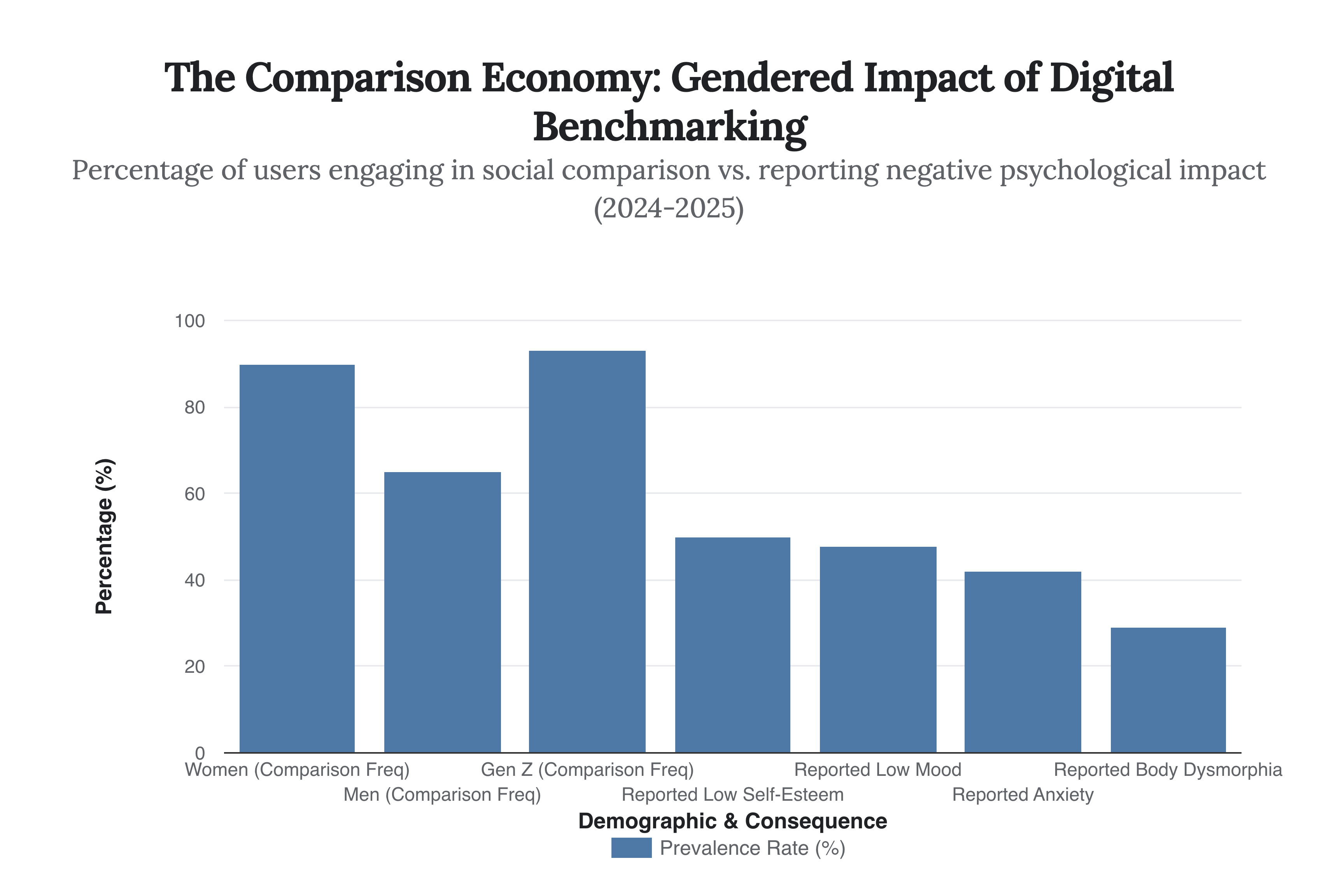 The data above reveals the efficiency of this machine. With 90% of women and 93% of Gen Z actively comparing their “finite” lives to the “infinite” curation of others, the result is a mass production of inadequacy. This is not an accidental byproduct; it is the economic engine of the platform. A user in despair is a user who buys. They buy beauty products to fix the “finite,” courses to unlock the “infinite,” and subscriptions to maintain the illusion.