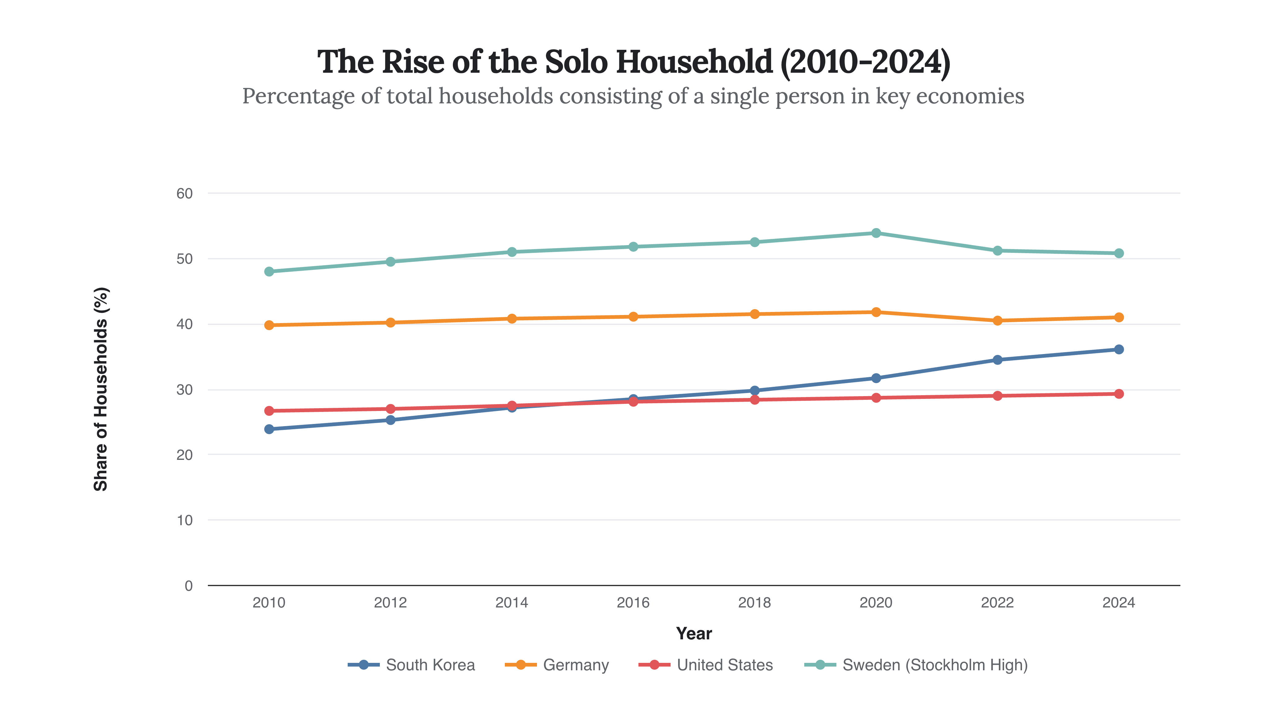 The foundation of the Solitude Economy is demographic. The fundamental economic unit is shrinking. In South Korea, single-person households hit a record 36.1% in 2024 (over 8 million households). In Sweden, that figure hovers near 33%. In the United States, the “nuclear family” model has eroded to the point where 29% of households contain exactly one person.