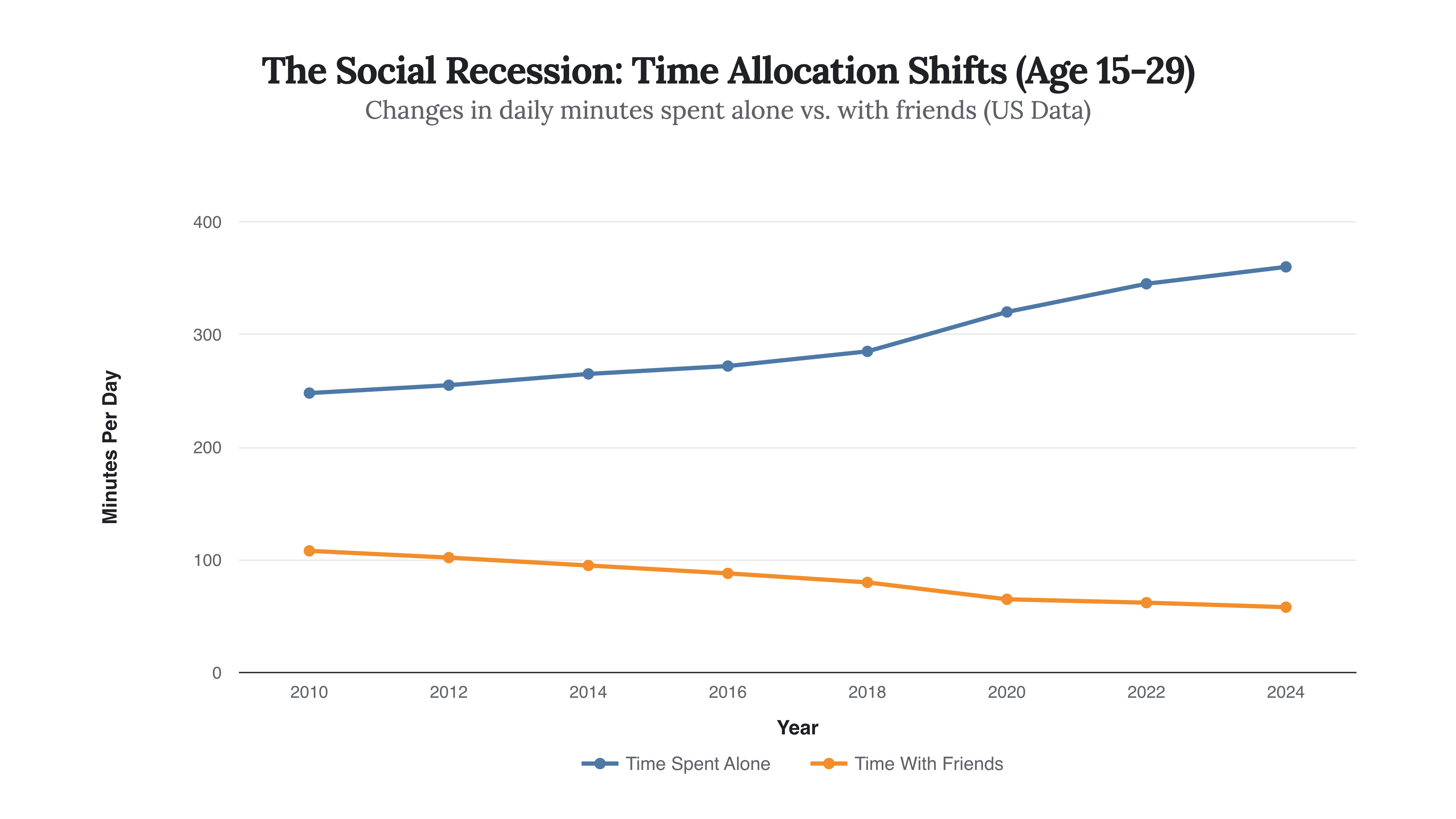 This shift represents a dangerous but profitable feedback loop: as time spent alone increases, social skills atrophy, making real-world interaction more “expensive” (emotionally and cognitively), which in turn drives higher demand for synthetic alternatives.
