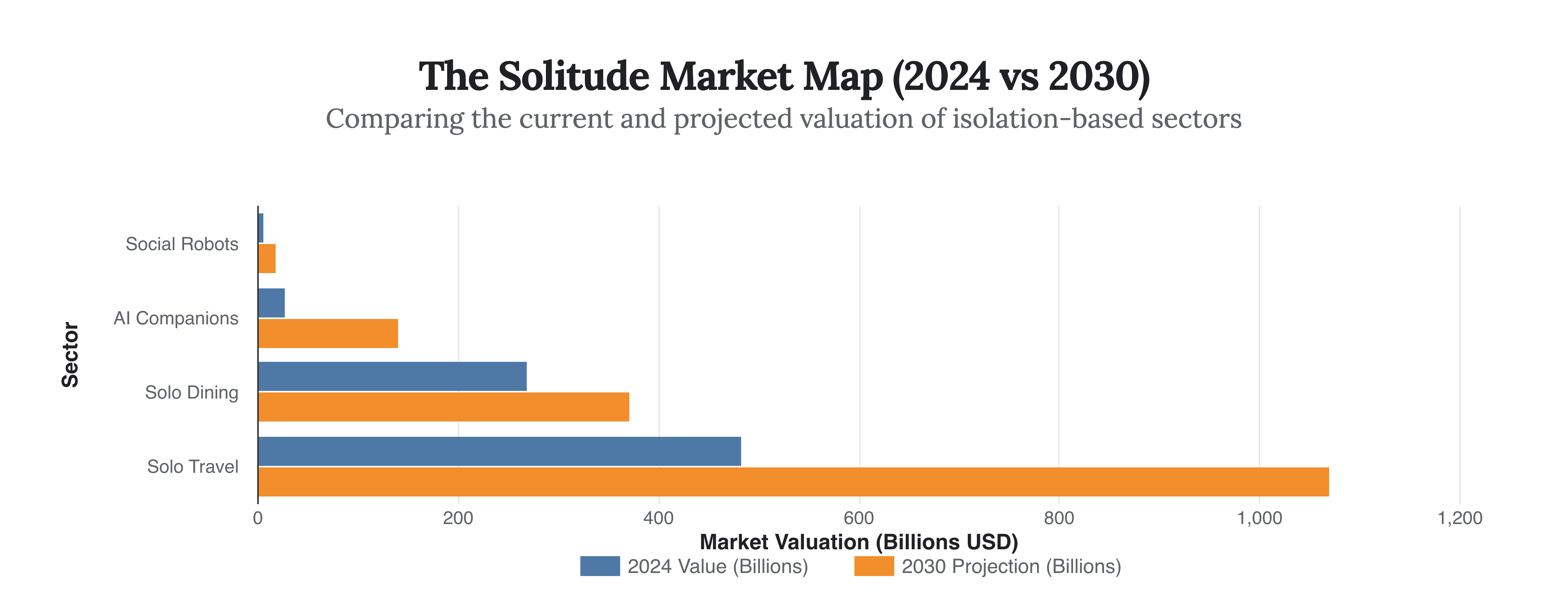 A deeper analysis of global market data reveals a far more uncomfortable truth: Loneliness is not a drain on the global economy; it is becoming one of its primary engines. When we aggregate the revenue generated by industries explicitly designed to service the isolated individual—solo travel ($482 billion), solo dining ($268 billion), AI companionship ($28 billion), and social robotics ($6 billion)—we find a burgeoning “Solitude Economy” valued at approximately $784 billion in 2024.