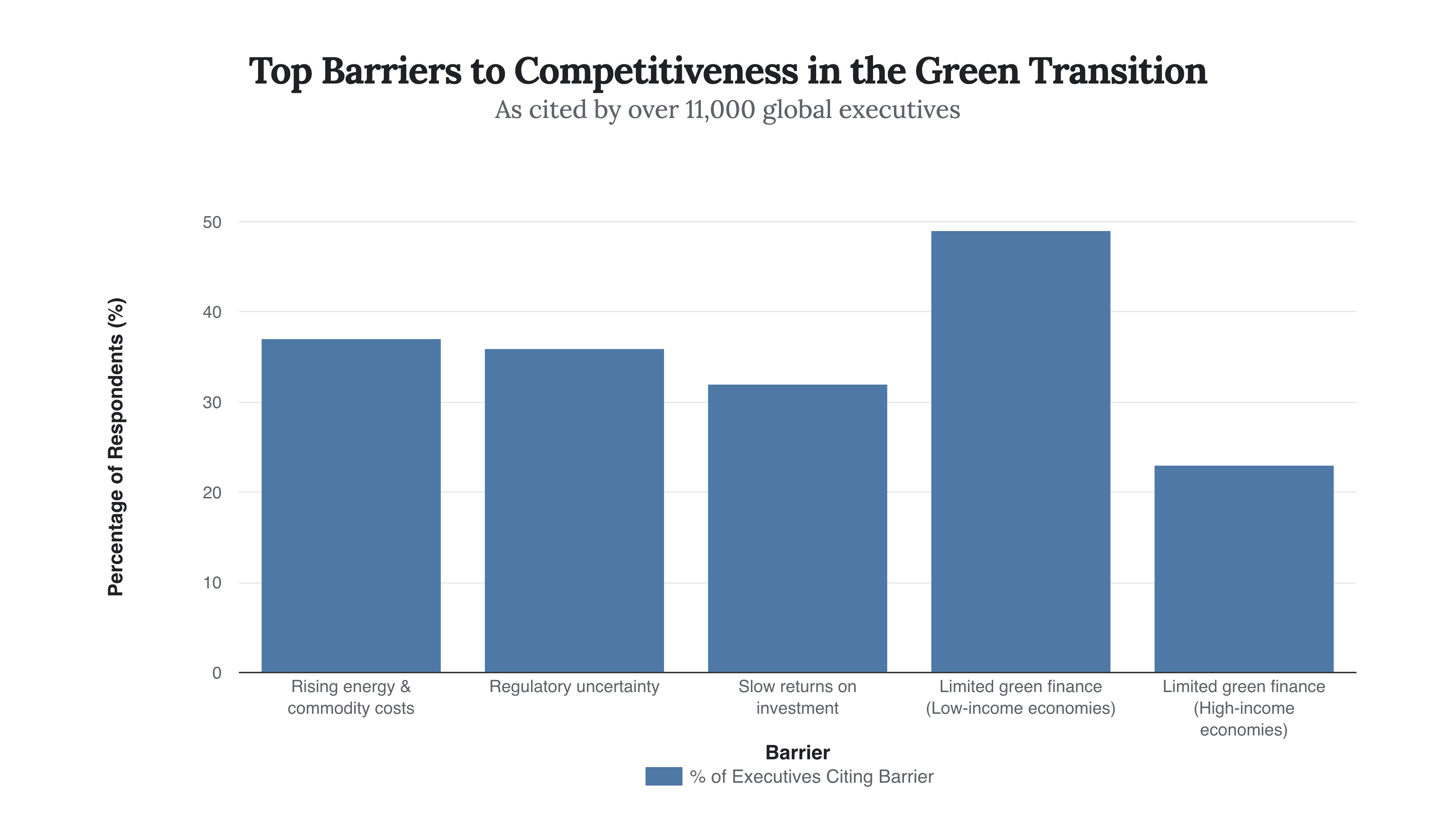 The survey pinpoints the primary obstacles hindering corporate climate action. While rising energy and commodity costs are the top concern for 37% of business leaders, regulatory uncertainty and the slow, often unpredictable, returns on green investments follow closely behind. These barriers create a vicious cycle: uncertainty deters investment, which in turn slows the development of the very technologies needed to bring down costs and accelerate returns.
