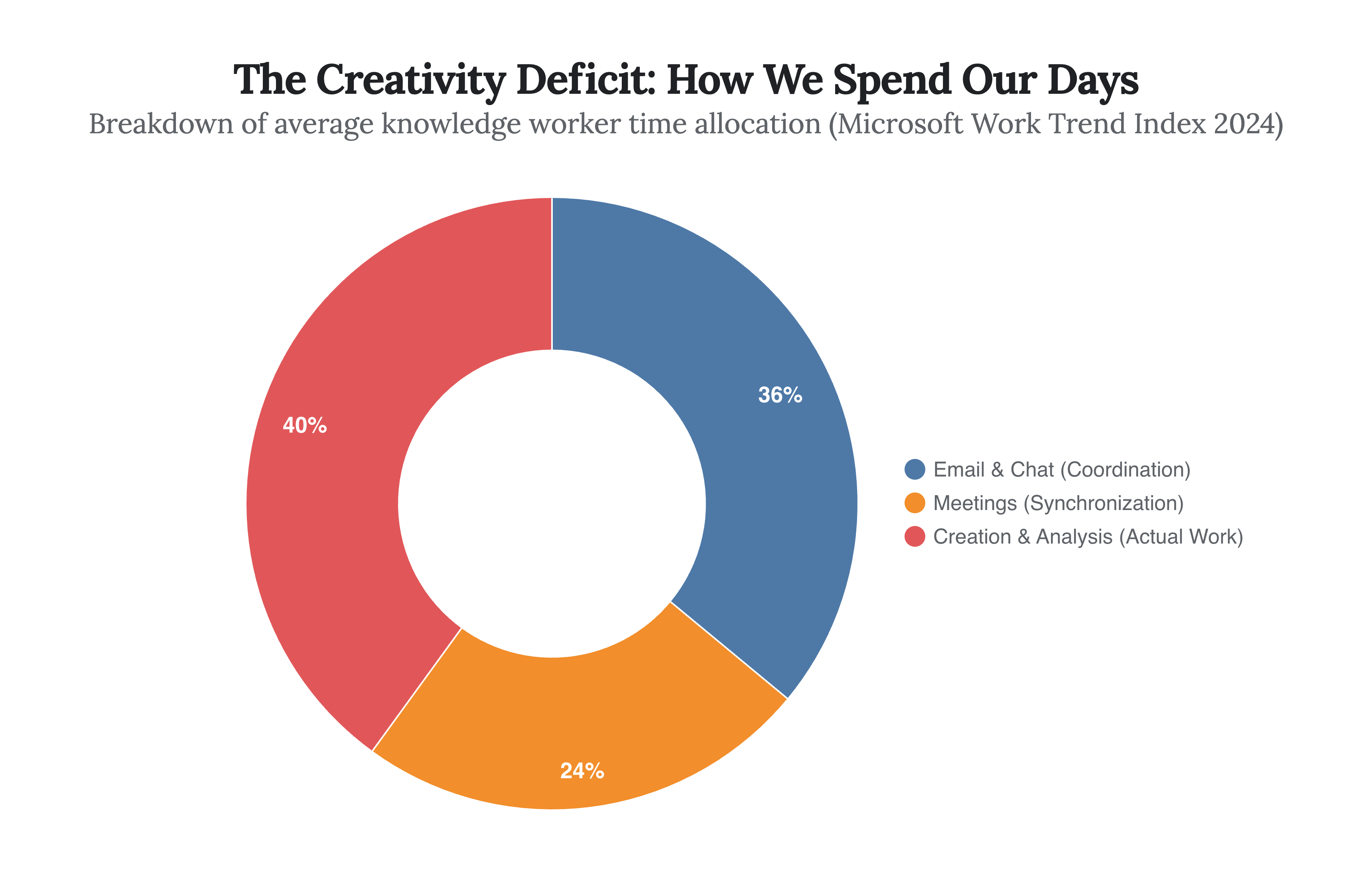 Microsoft’s 2024 Work Trend Index provides the smoking gun. A staggering 60% of the average workday is consumed by communication—emails, chats, and meetings—leaving only 40% for the actual creative or analytical work the employee was hired to do. We have turned high-paid professionals into human APIs, simply passing data between disparate systems.