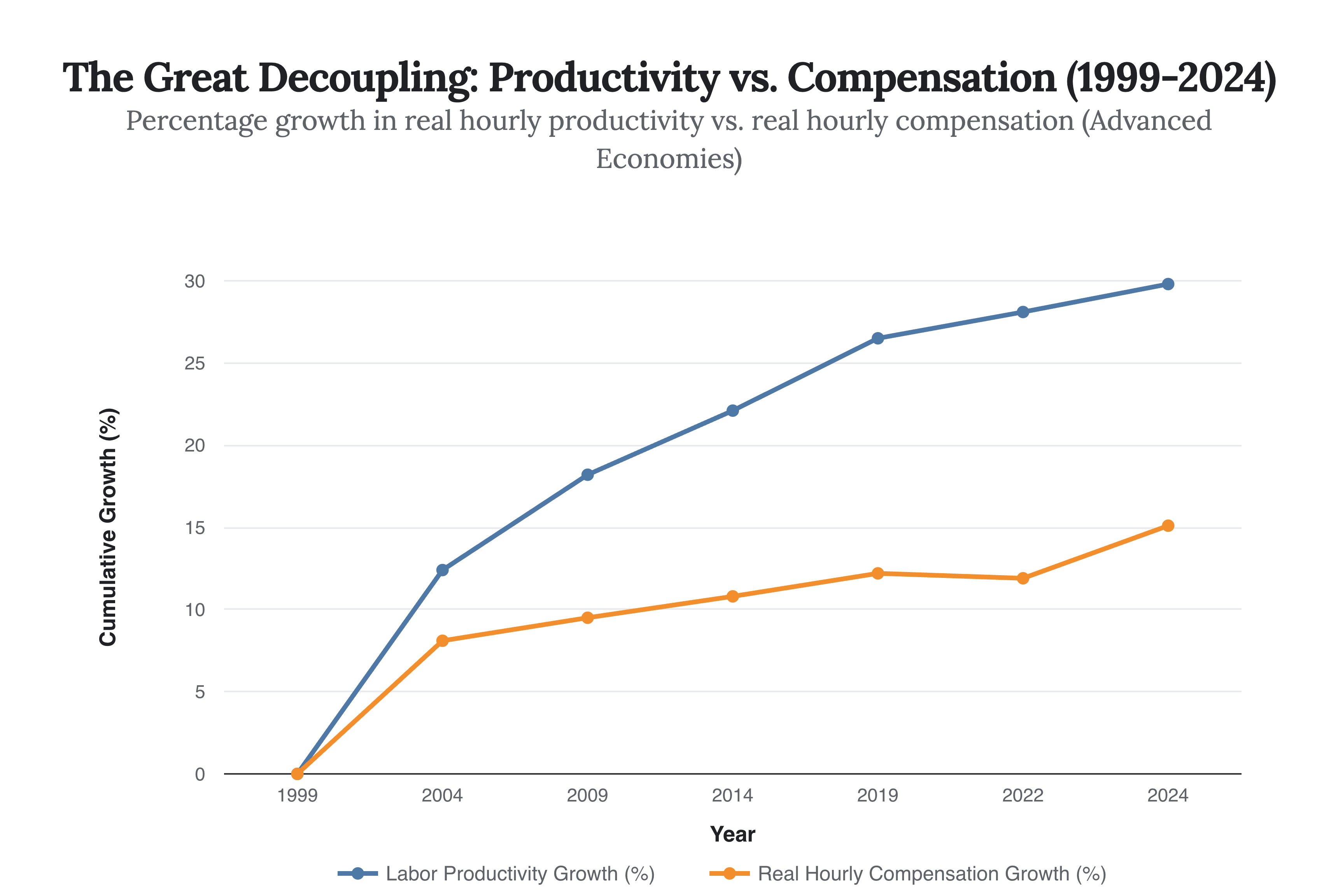 Data from the International Labour Organization (ILO) and the Economic Policy Institute reveals a widening “scissors” effect. While technology has exponentially increased the output per hour of the average worker, real compensation has flatlined or grown at a fraction of that pace. The surplus value is not reinvested in the workforce but captured by capital (shareholders) and the machinery itself (AI/SaaS investment).