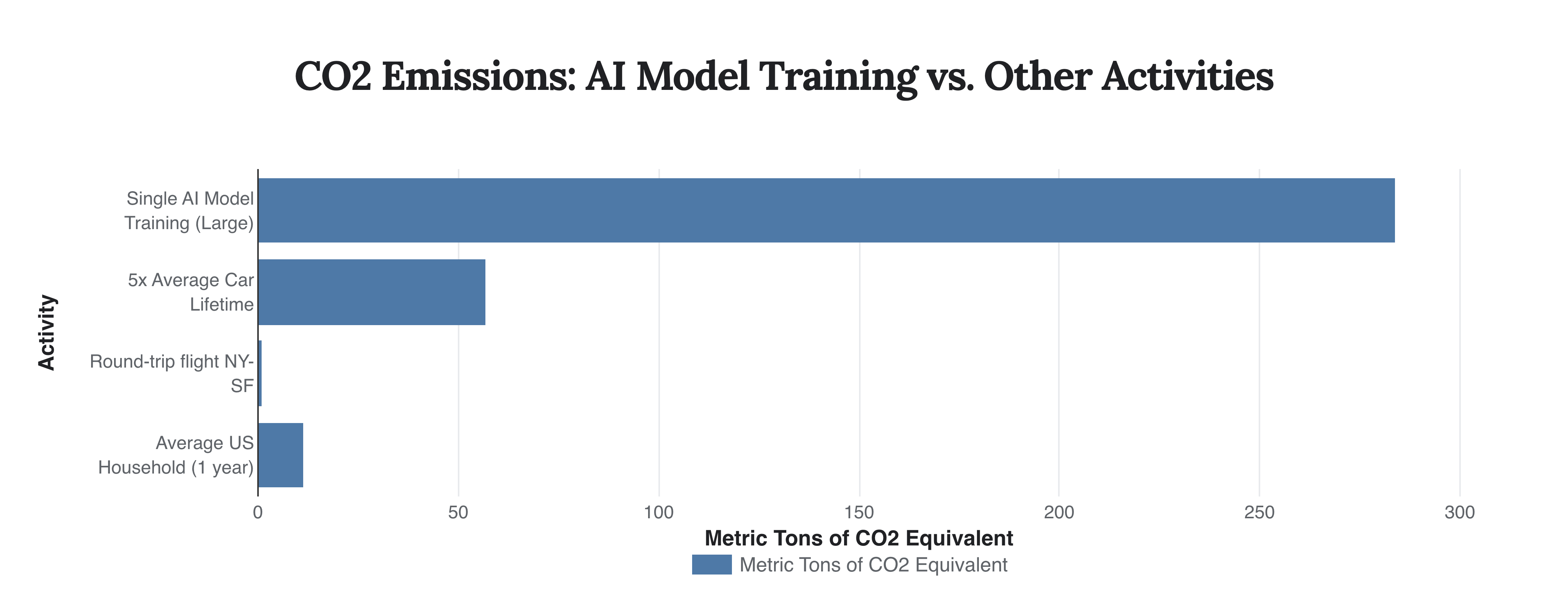 Caption: This chart provides a stark comparison of the carbon dioxide emissions from training a single large AI model against other common activities, highlighting the significant environmental cost of model development.