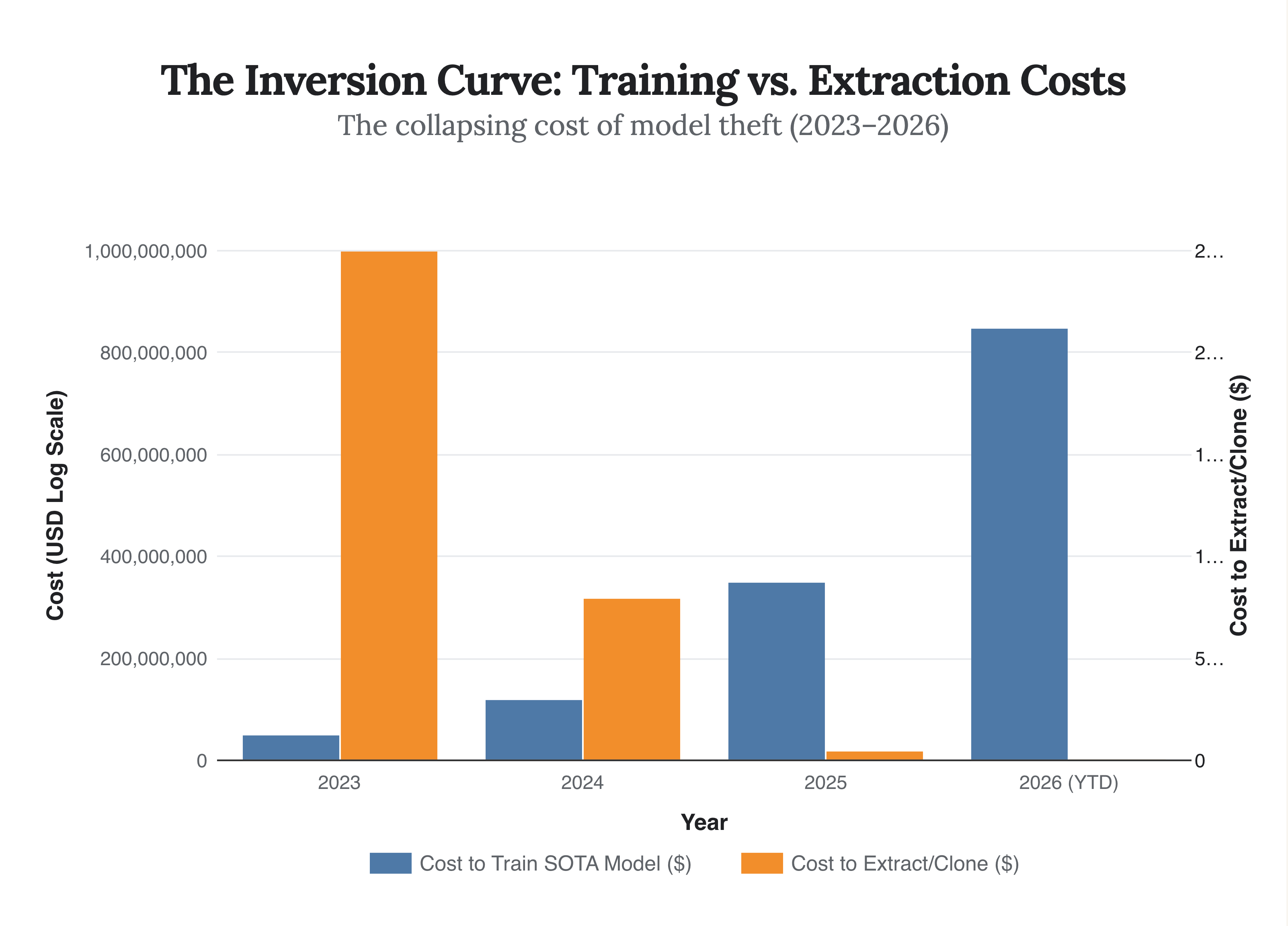 Applying the Supply Chain Forensic lens, we see a catastrophic decoupling of value and defense. In 2023, “stealing” a model meant stealing weights—a heist requiring inside access and massive bandwidth. Today, theft is purely behavioral. By querying an API with carefully crafted inputs (the “Bill of Materials” for the attack), adversaries can train a surrogate model that mimics the target’s decision boundary with 99% fidelity.