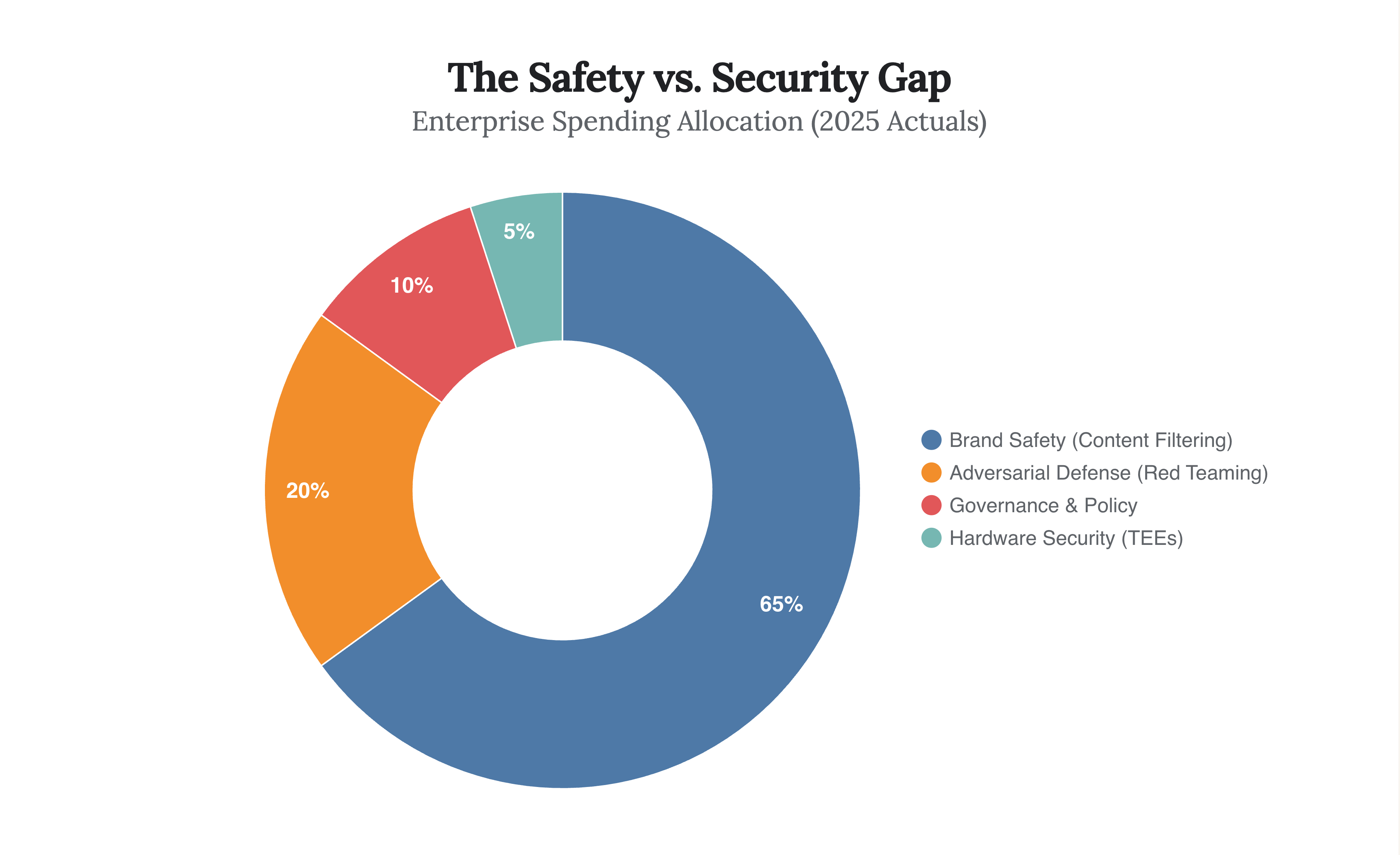 Vendors have rushed to sell “Safety Shields” that are effectively regex filters, while the deep, architectural security required to stop agentic hijacking remains underfunded. The budget is flowing to the visible problem (PR risk) rather than the existential problem (Control risk).