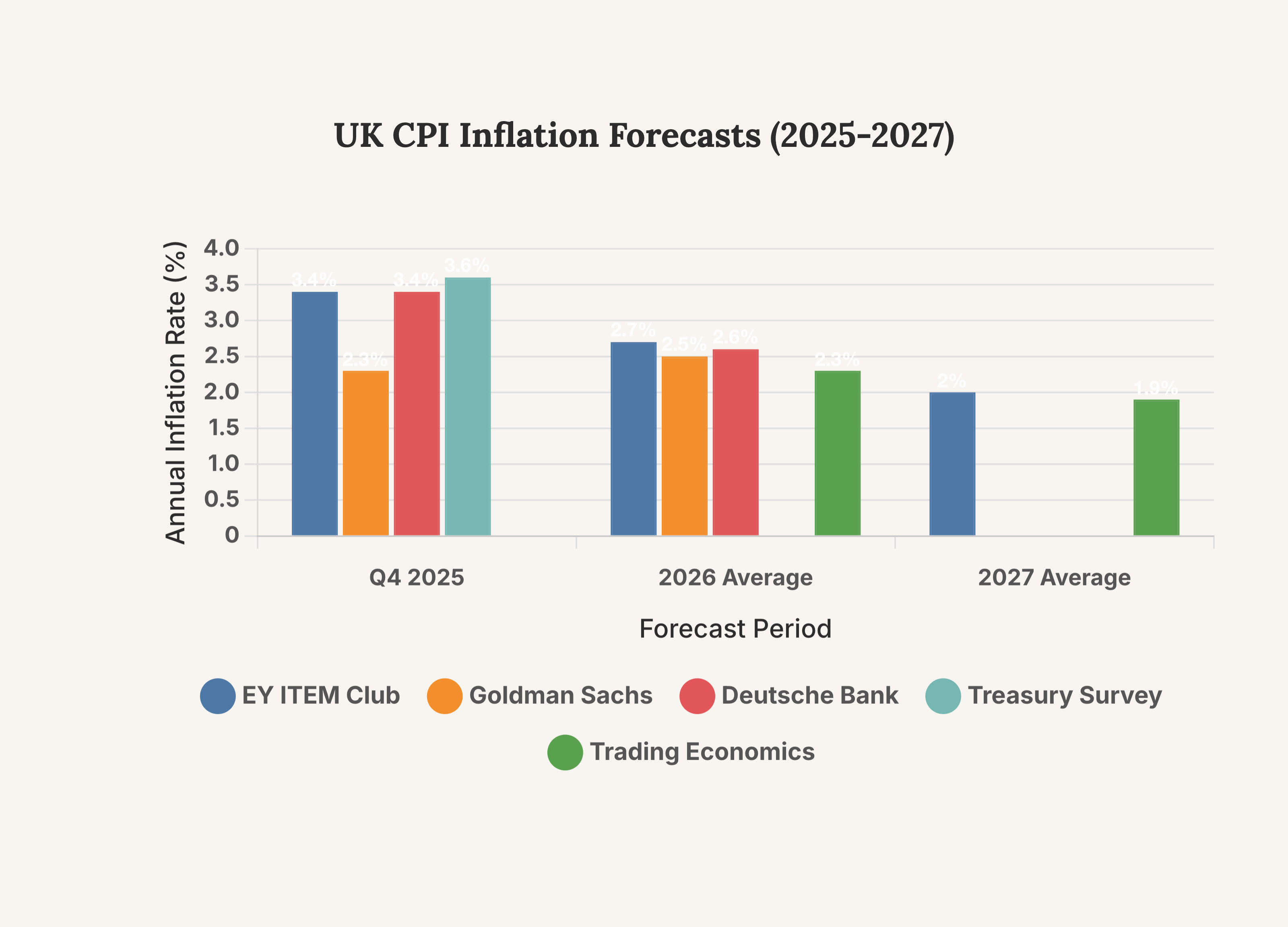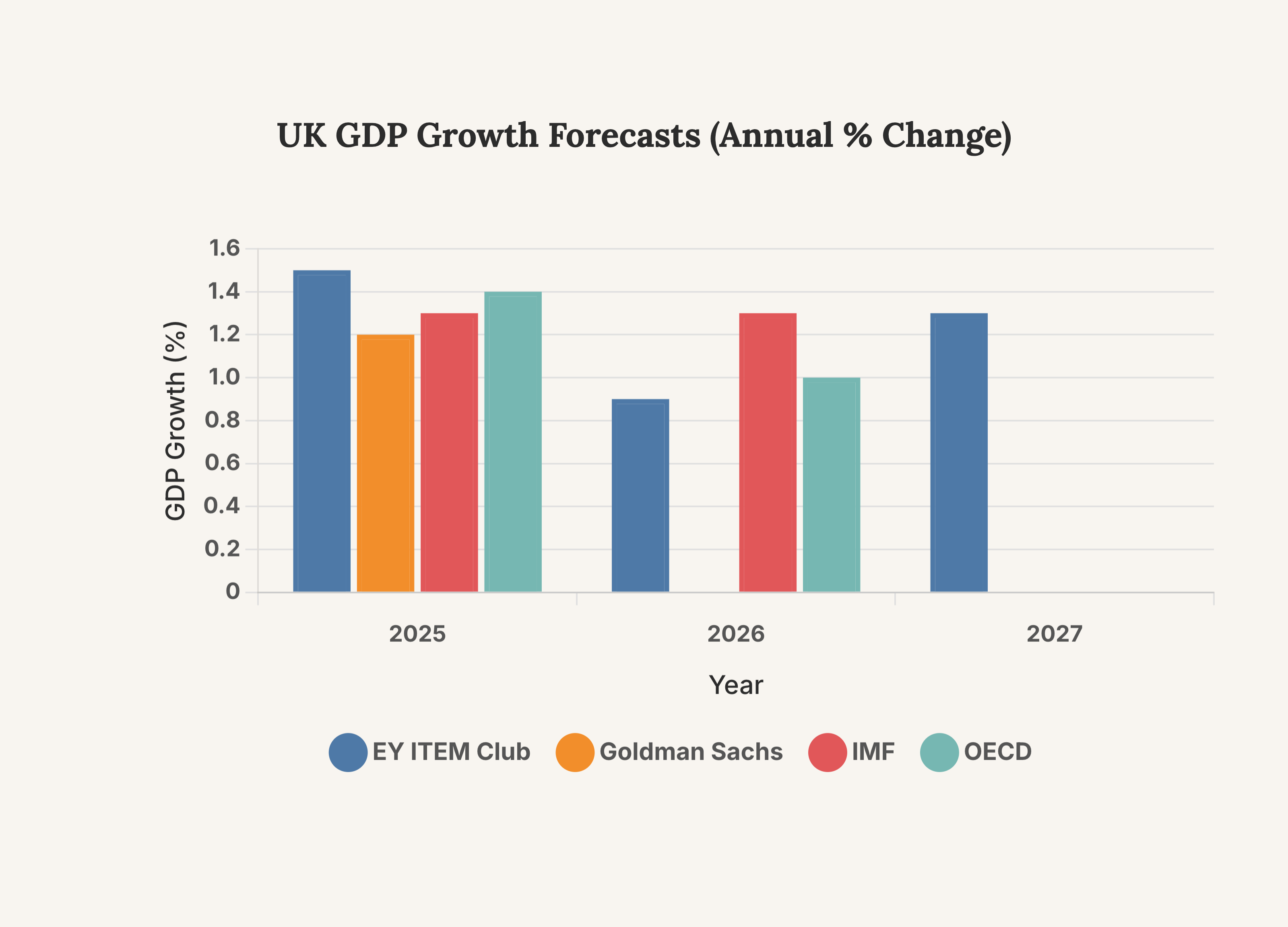 This chart compares GDP growth forecasts, highlighting the expected slowdown in 2026 and the differing views on the pace of the UK’s economic expansion.